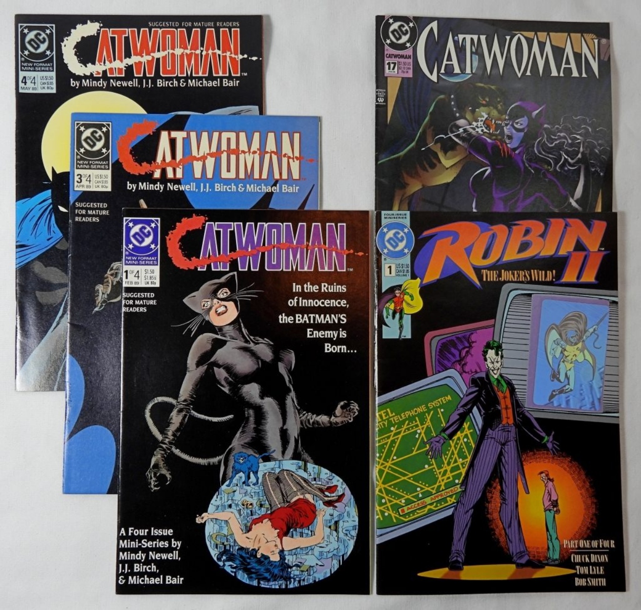 10-DC ASSORTED COMICS- 1989-1995- CATWOMAN- 1989-NO. 1,3,4 OF 4 & 17. BATMAN LEGENDS OF THE DARK KNIGHT-1989- NO. 2, 10, 4, 3, 5. ROBIN II THE JOKER’S WILD-1991- NO. 1. ALL OF THESE COMICS DO SHOW WEAR, PREOWNED.