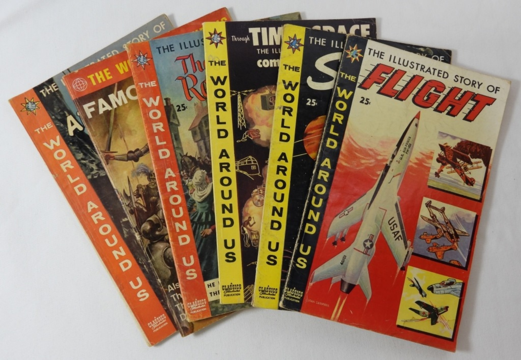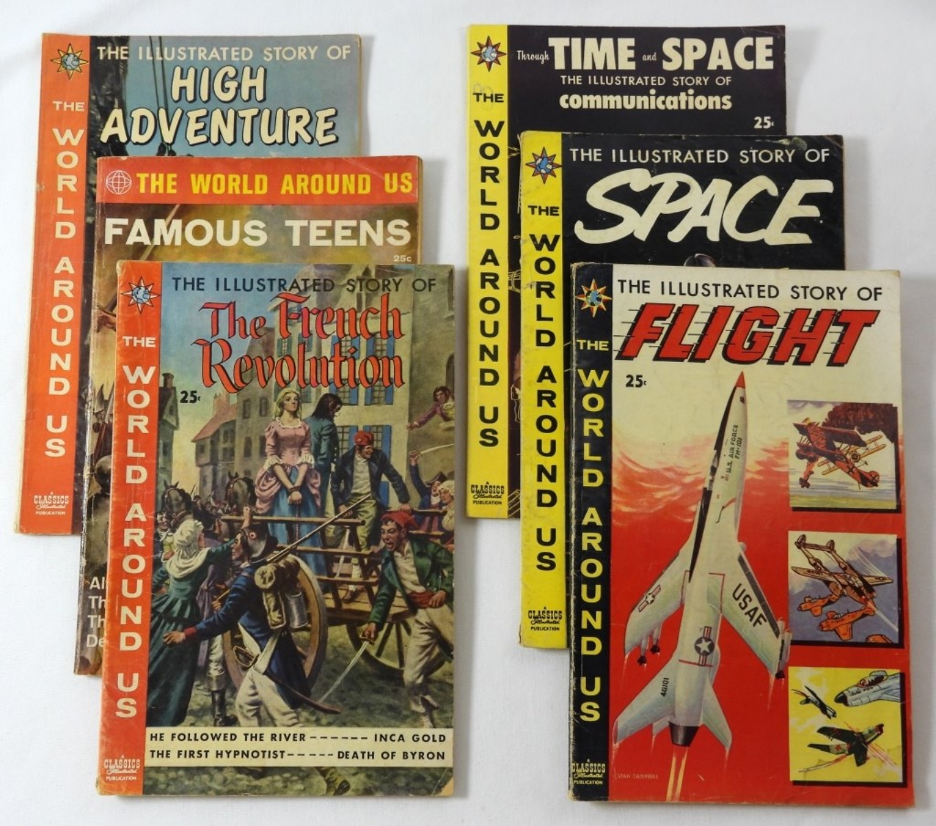 6 ASSORTED SILVER AGE 1959-1961 THE WORLD AROUND US COMICS: HIGH ADVENTURE (NOV 60 NO 27), FAMOUS TEENS (MAY 61 NO 33), THE FRENCH REVOLUTION (OCT 59 NO 14), TIME AND SPACE (APR 60 NO 20), FLIGHT( APR 59 NO 8), SPACE