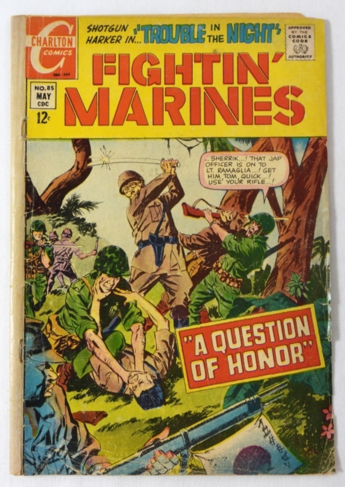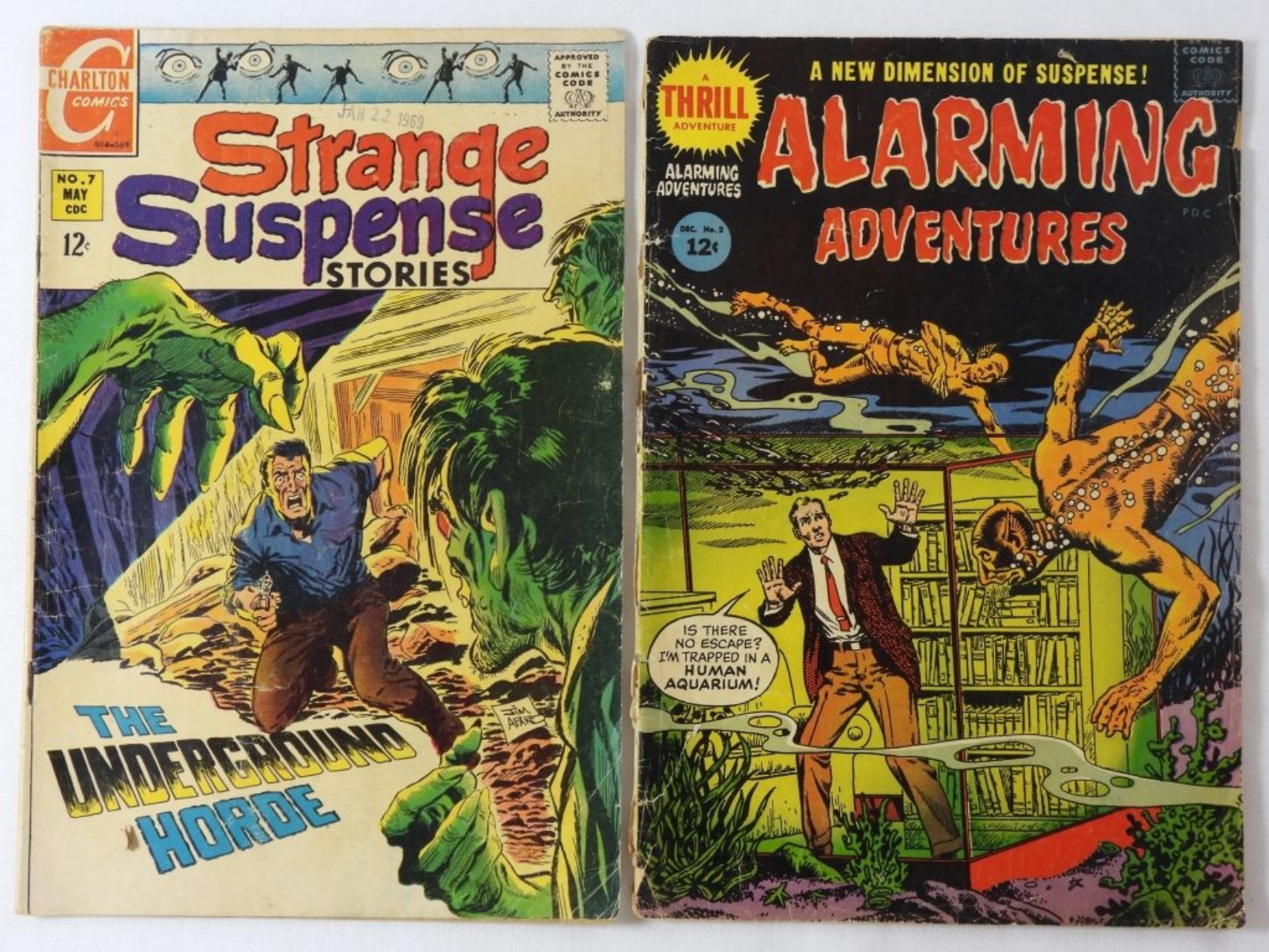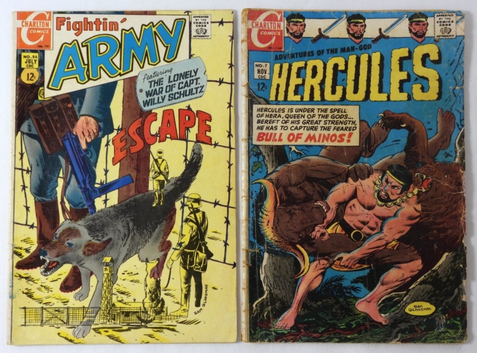 SILVER AGE CHARLTON COMIC LOT (1968-69): HERCULES NO 7, FIGHTIN’ ARMY NO 86, FIGHTIN’ MARINES NO 85, ALARMING ADVENTURES NO 2, AND STRANGE SUSPENSE STORIES NO 7. COMICS IN MIXED CONDITION. ALL 12 CENT CHARLTON LOT.