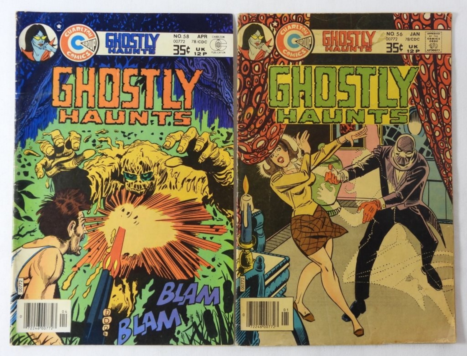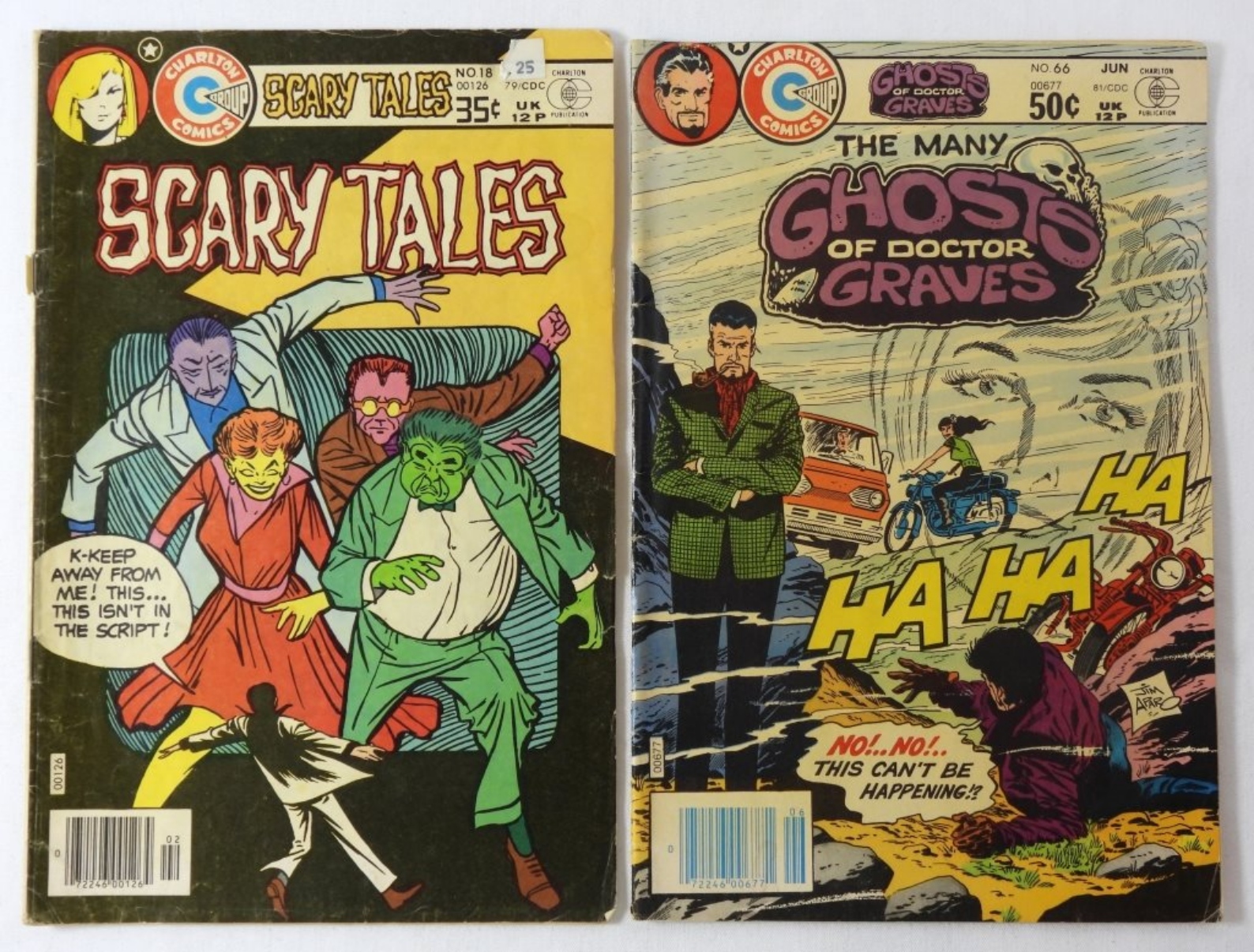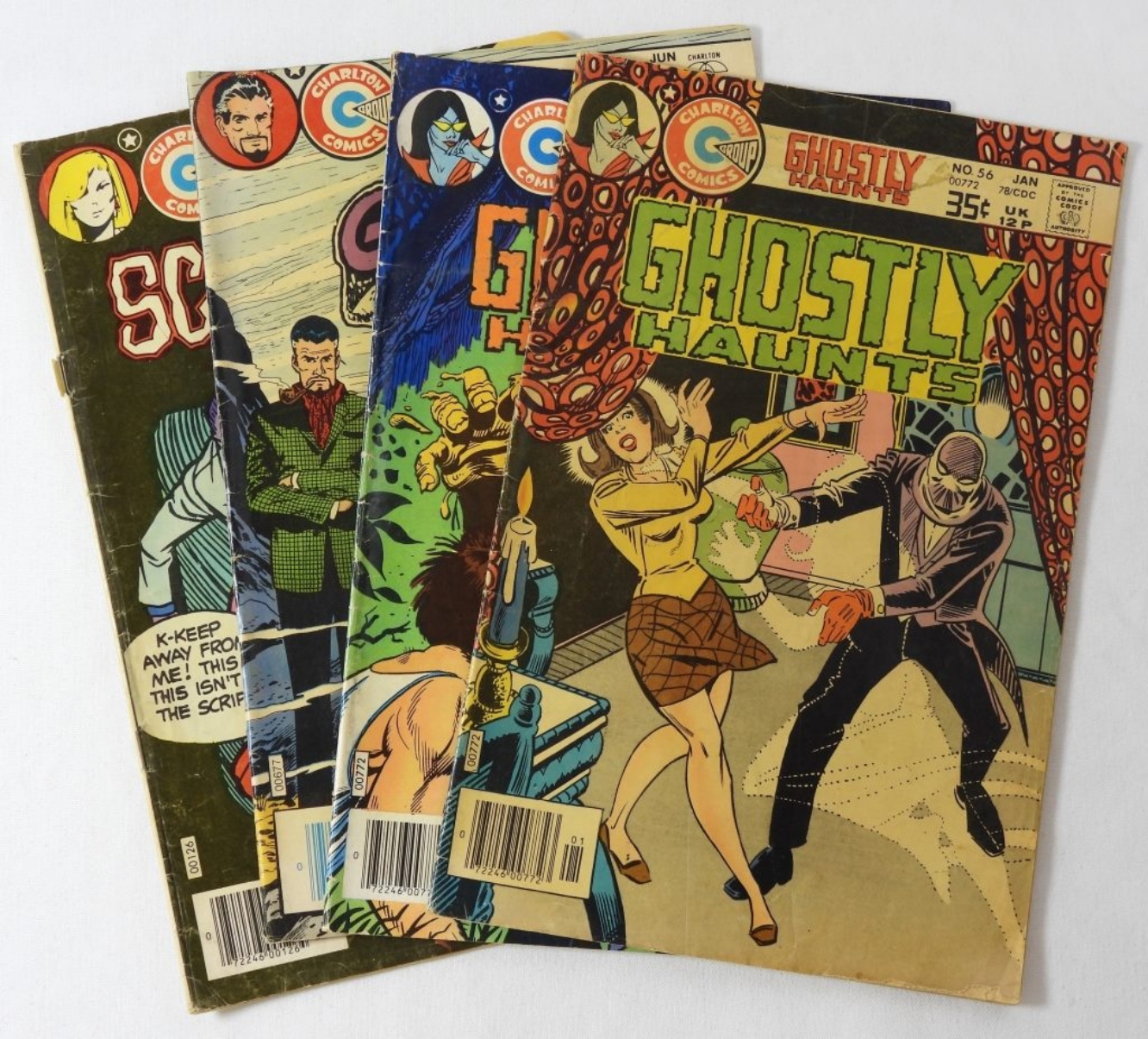CHARLTON GHOSTS/SCARY TALES COMIC LOT: SCHARY TALES 1979 NO 18, GHOSTLY HAUNTS 1978 NO 56 AND 58, GHOSTS OF DOCTOR GRAVES 1981 NO 66. COMICS IN MIXED CONDITIONS.