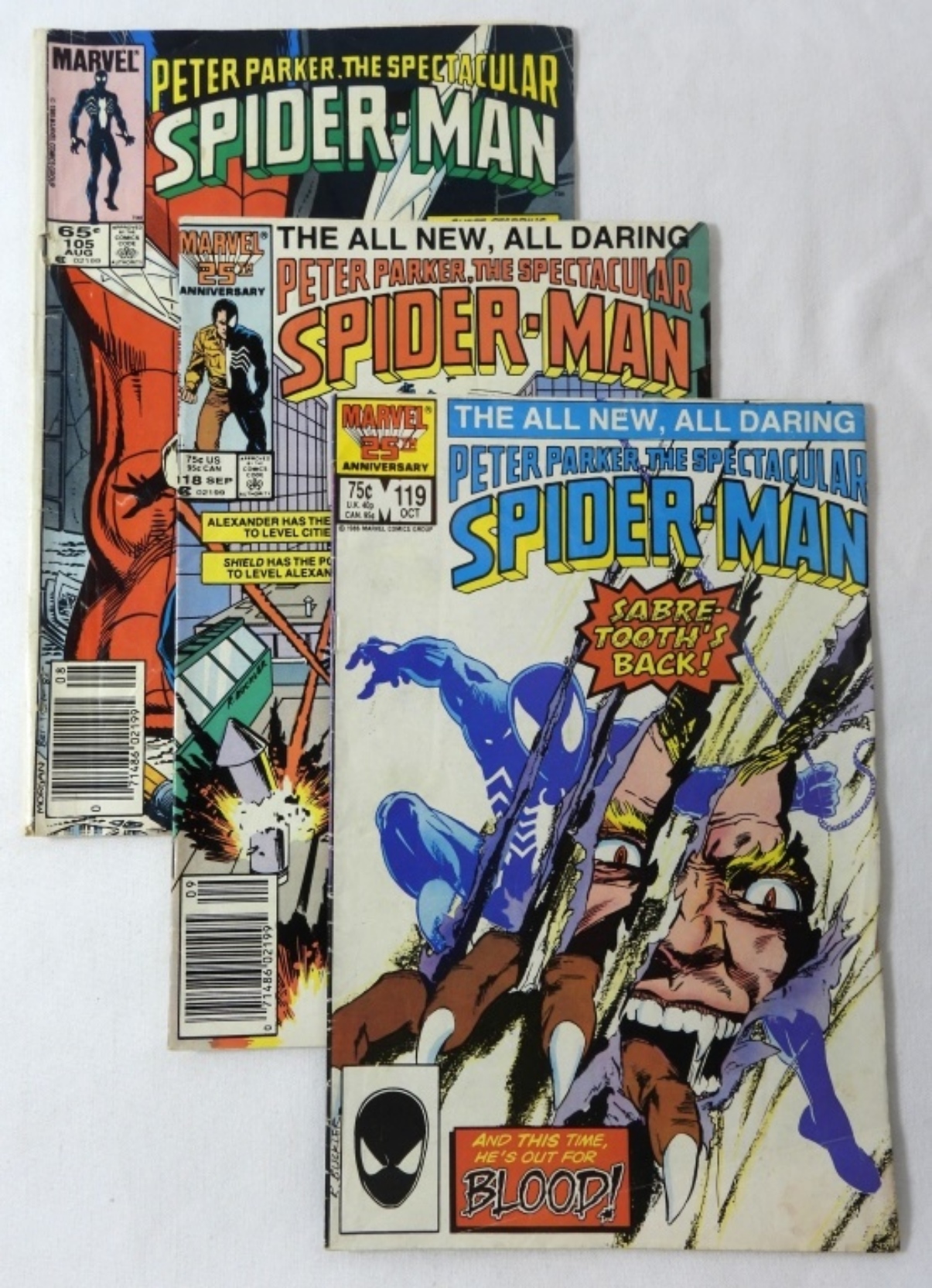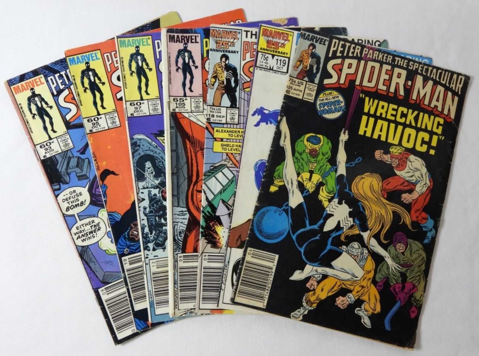 7 ASSORTED MARVEL PETER PARKER THE SPECTACULAR SPIDER-MAN. NO 93, 95, 97, 105, 118, 119, 125. GOOD CONDITIONS