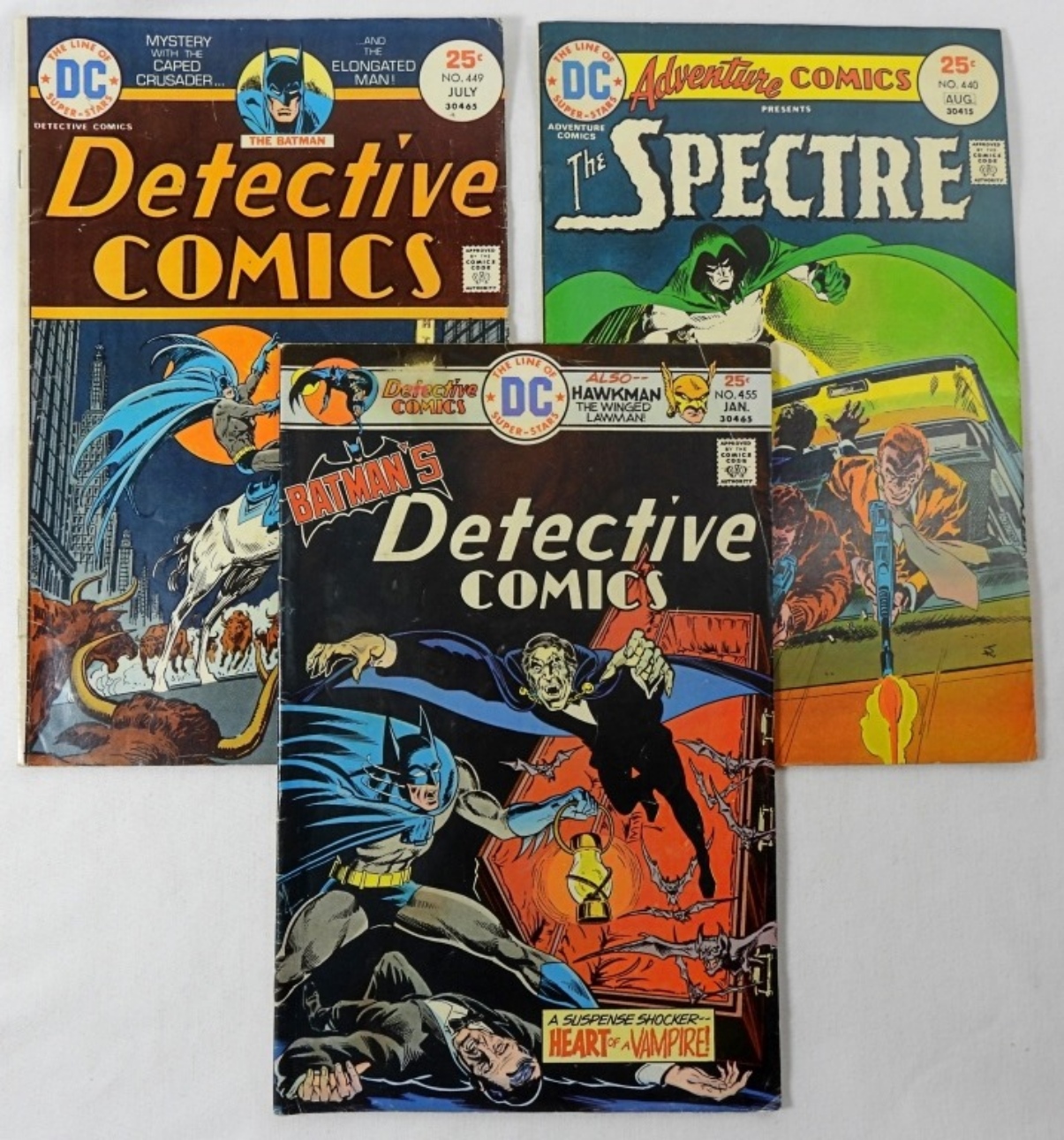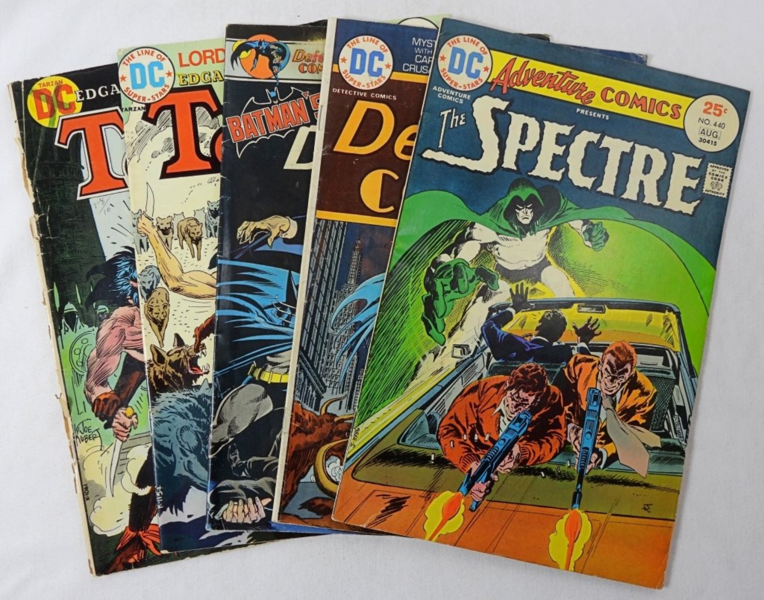5 ASSORTED BRONZE AGE DC COMICS IN MIXED CONDITIONS. INCLUDING SPECTRE, DETECTIVE COMICS AND TARZAN (ONE TARZAN IS MISSING LARGE PART OF BACK COVER)