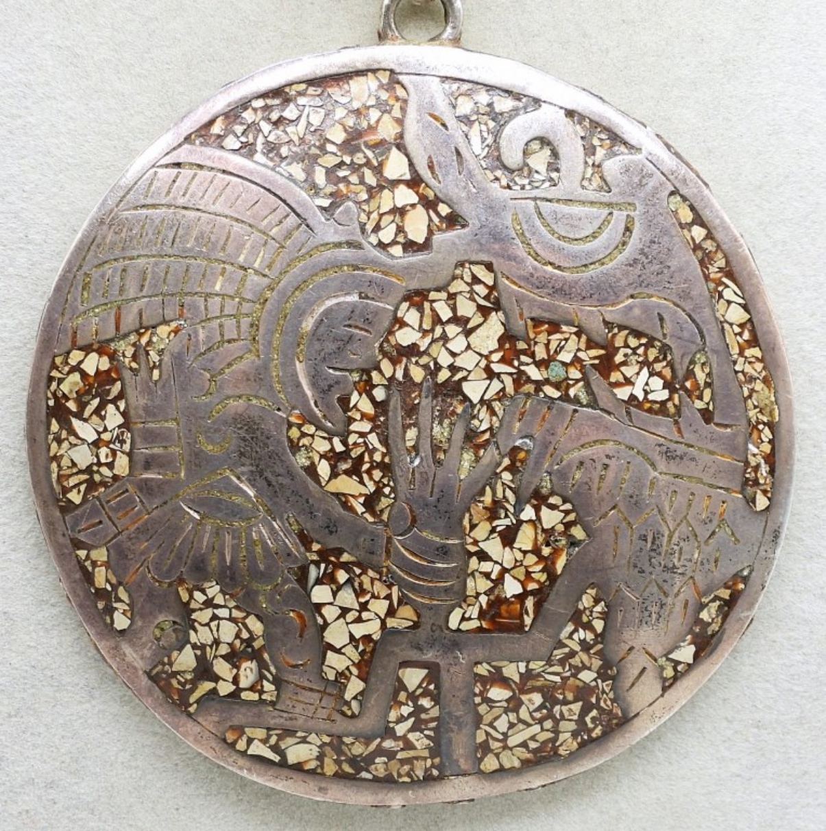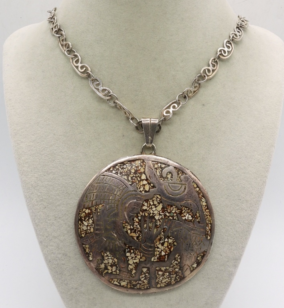 VINTAGE “EDO MEX 925″ CHIP INLAY AZTEK/MAYAN STERLING SILVER PENDANT WITH GORGEOUS STERLING CHAIN. PENDANT MEASURES 3″, CHAIN IS 18”. (49.9 DWT)