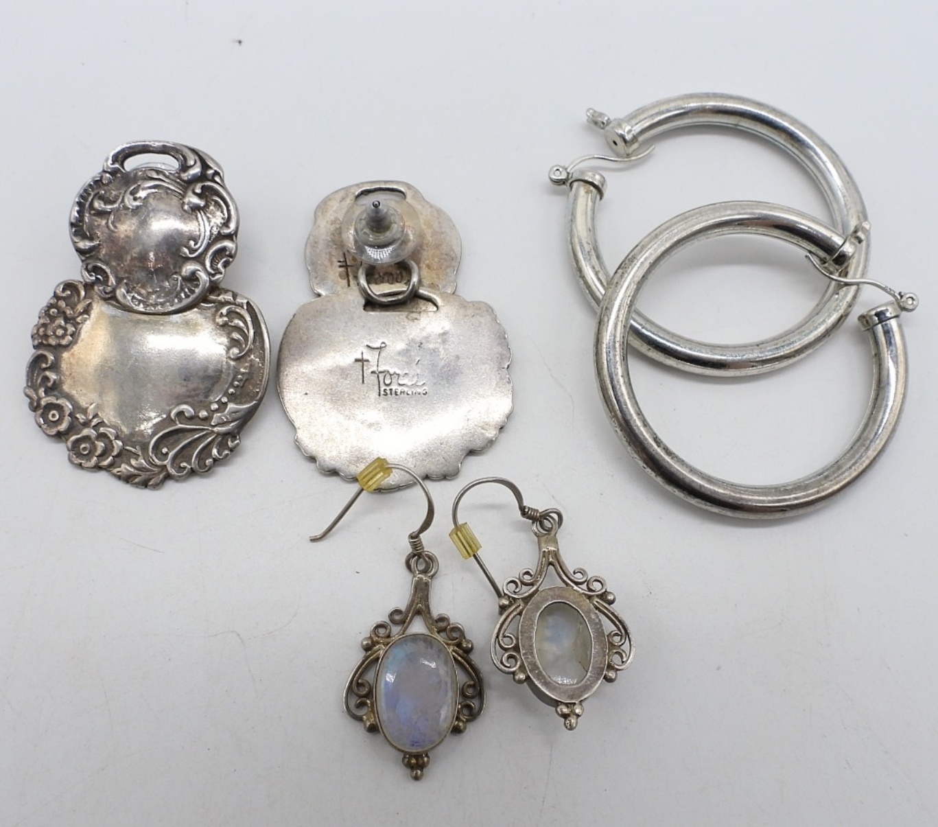 ONE PAIR OF STERLING MOONSTONE EARRINGS, TWO PAIR OF STERLING EARRINGS. ALL PIERCED. 27 DWT