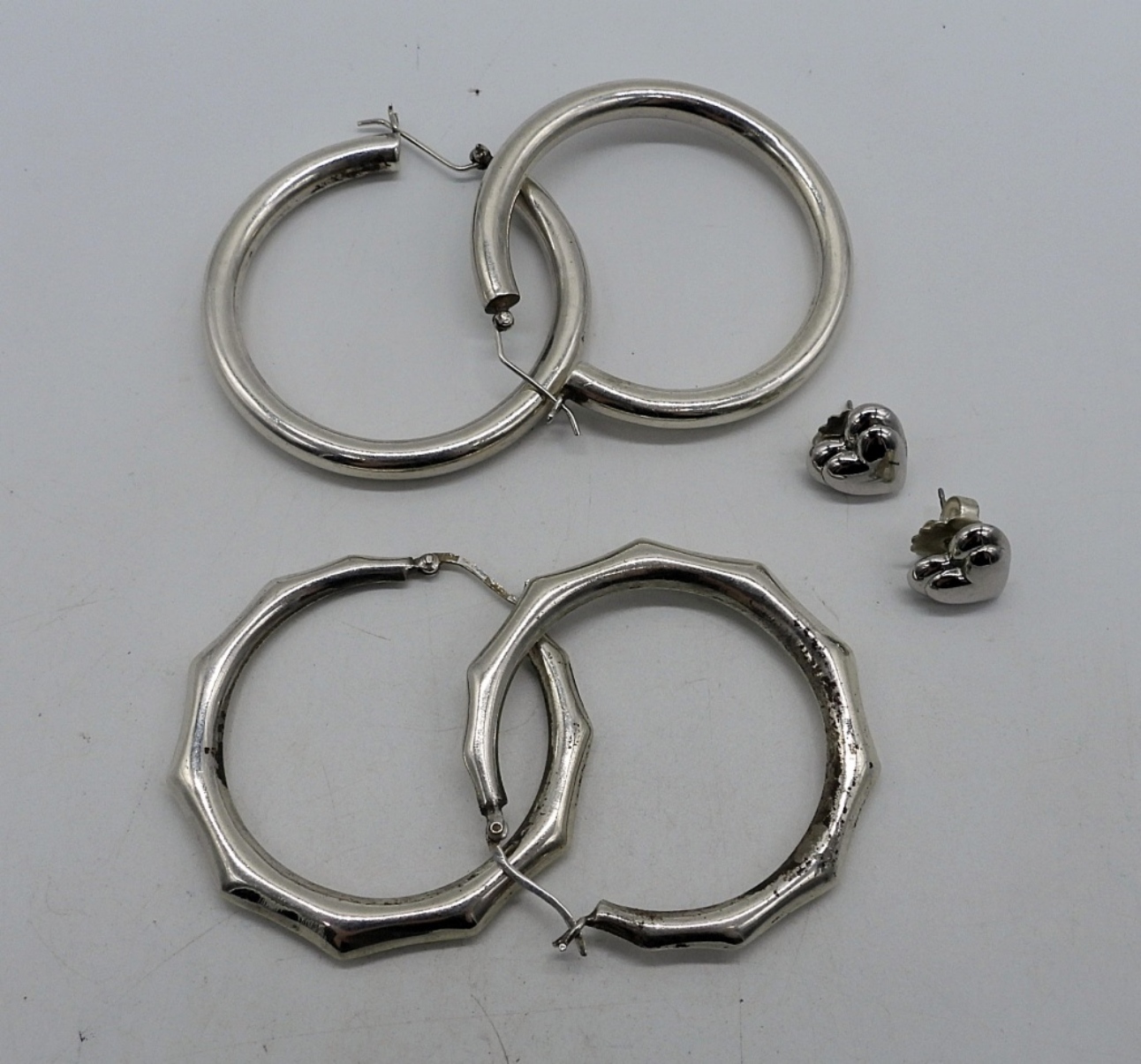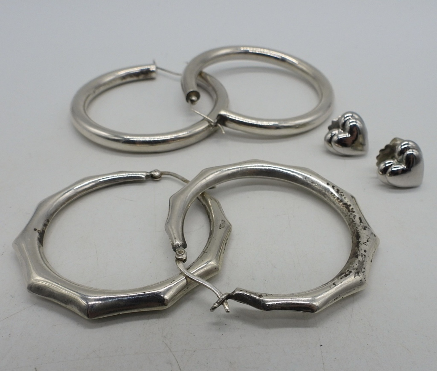 TWO PAIR OF HOOPS, ONE PAIR OF HEART STUDS. HOOPS ARE 2″. (17.3 DWT)