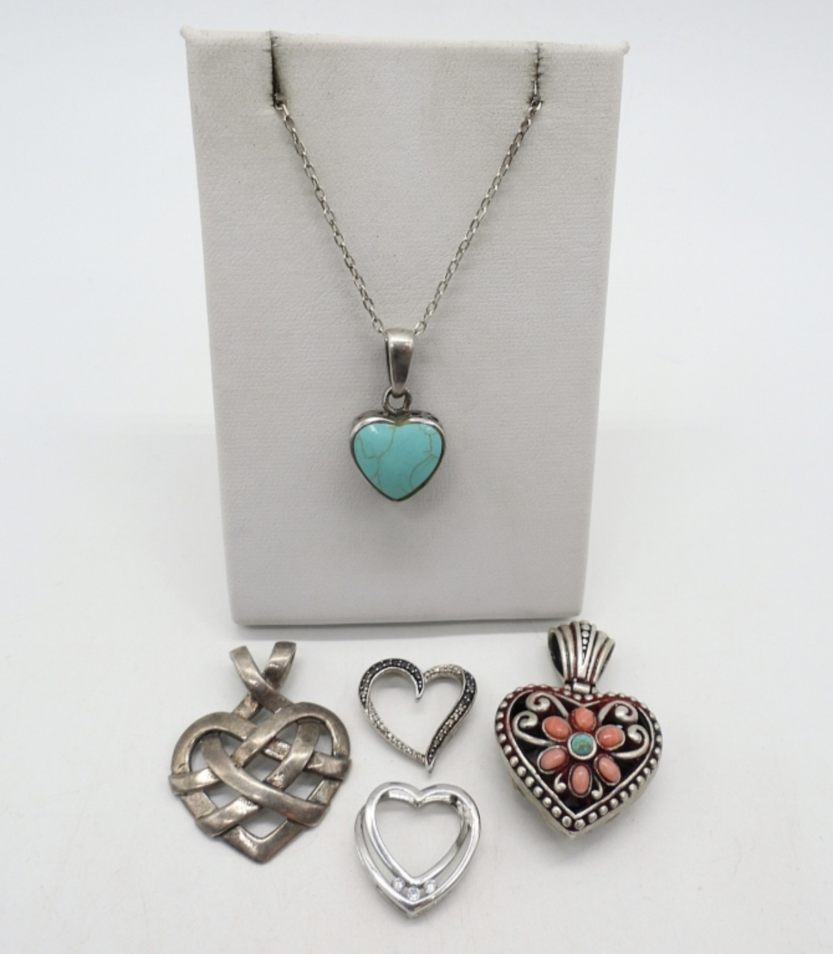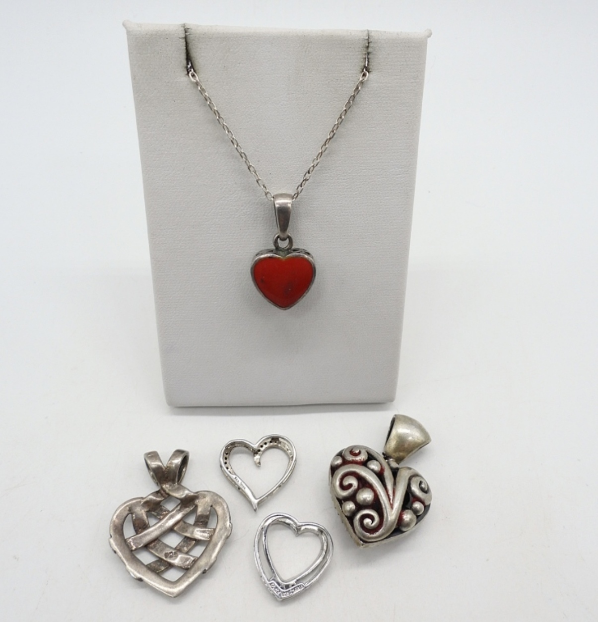 FIVE STERLING PENDANTS, ALL HEART SHAPED. SOME WITH MOISSANITE GEMSTONES. ONE STERLING CHAIN, 20″. ONE PENDANT HAS SOME RED RESIDUE ON IT. ONE PENDANT IS DOUBLE SIDED. (18.1 DWT)
