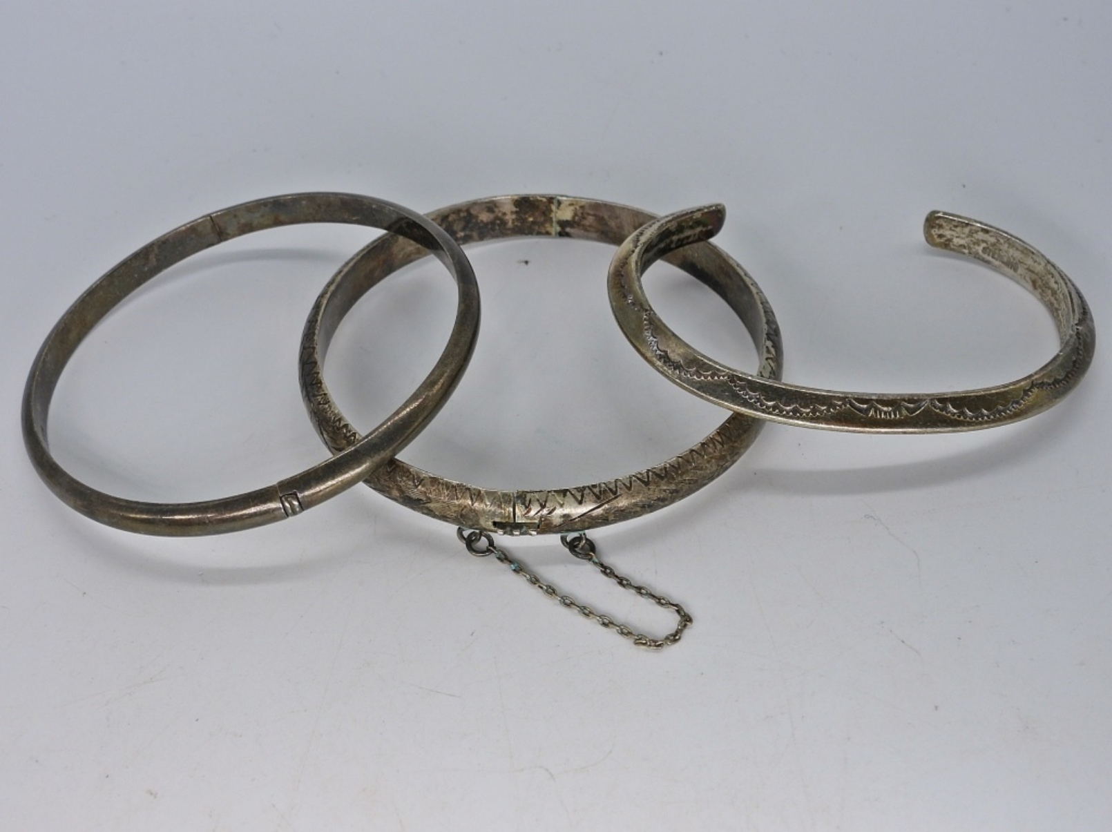 THREE VINTAGE STERLING BRACELETS, ALL TARNISHED. CLASPS & HINGES WORK. 7-8″. (25.6 DWT)