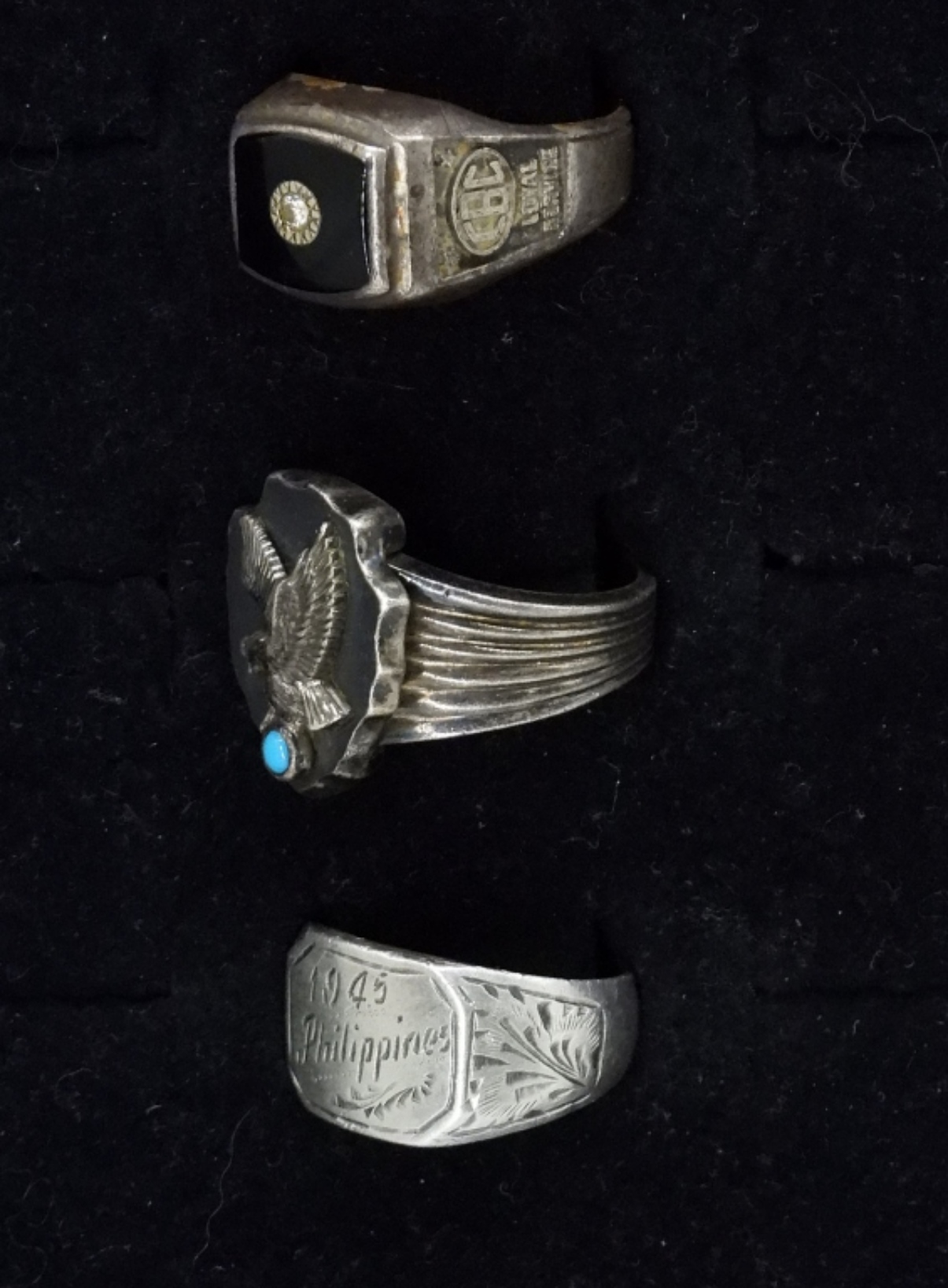 THREE VINTAGE STERLING RINGS. EAGLE/ARROWHEAD/TURQUOISE RING SIZE 12. “1945 PHILIPPINES” RING SIZE 10. “CBC LOYAL SERVICE” RING SIZE 11. TWO ARE TARNISHED. (26.4 DWT)