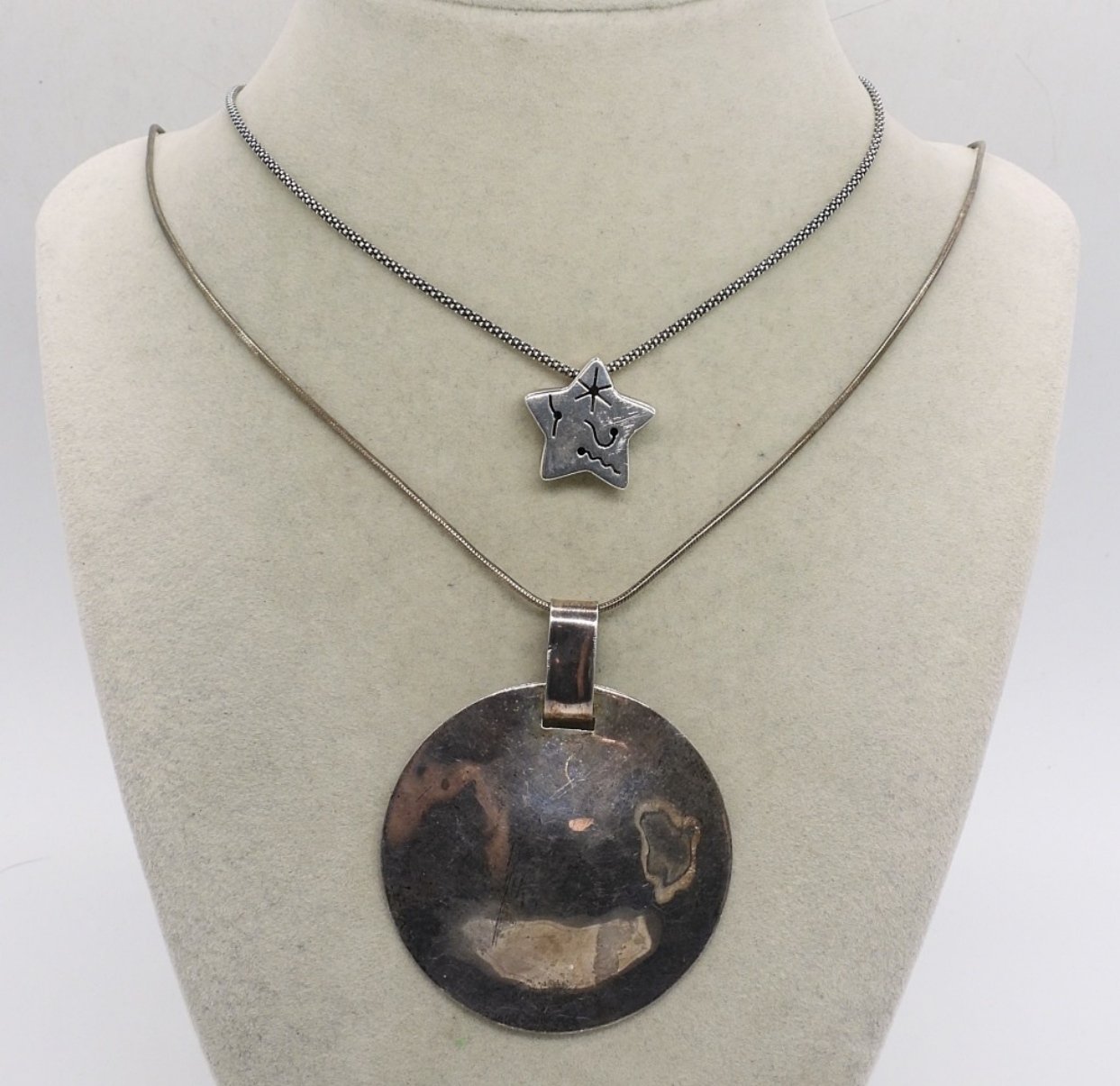 TAXCO STAR CONSTELLATION PENDANT. “TM-10? MEXICO 925″ (CANT READ THE FULL NUMBER AFTER TM). ON A 20” CHAIN. ONE STERLING ROUND PENDANT MARKED “ONE WORLD” 2.5″. CHAIN 28″. (22.5 DWT)