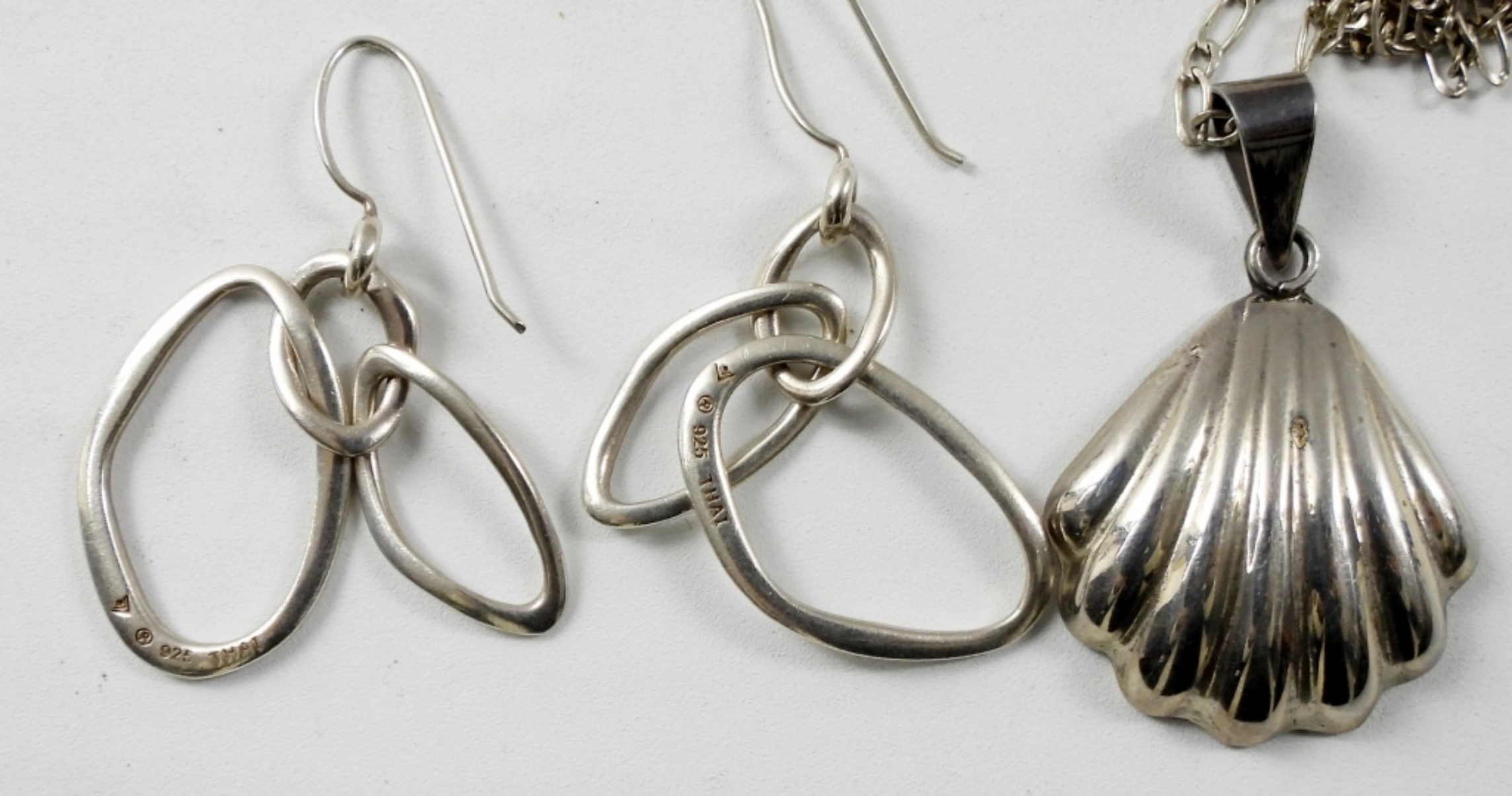 22″ 925 MEXICO PENDANT NECKLACE, A PAIR OF EARRINGS AND 2 BANGLE BRACELETS (29.2 DWT)