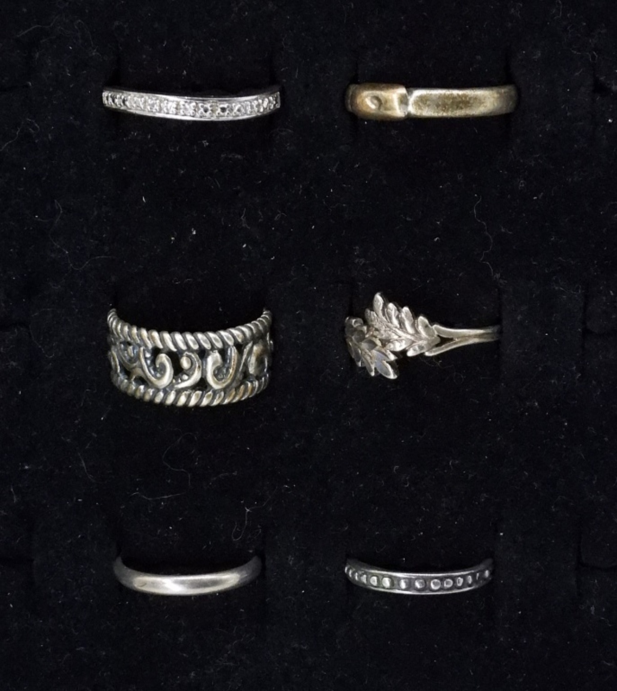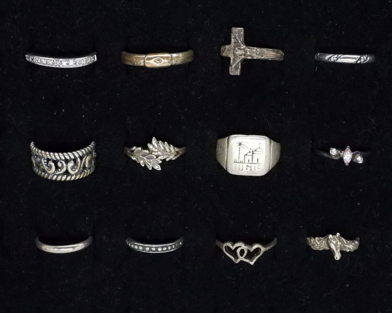 12 STERLING RINGS, MOSTLY BANDS. SOME GEMSTONES. SIZES 5-8.5 (19 DWT)