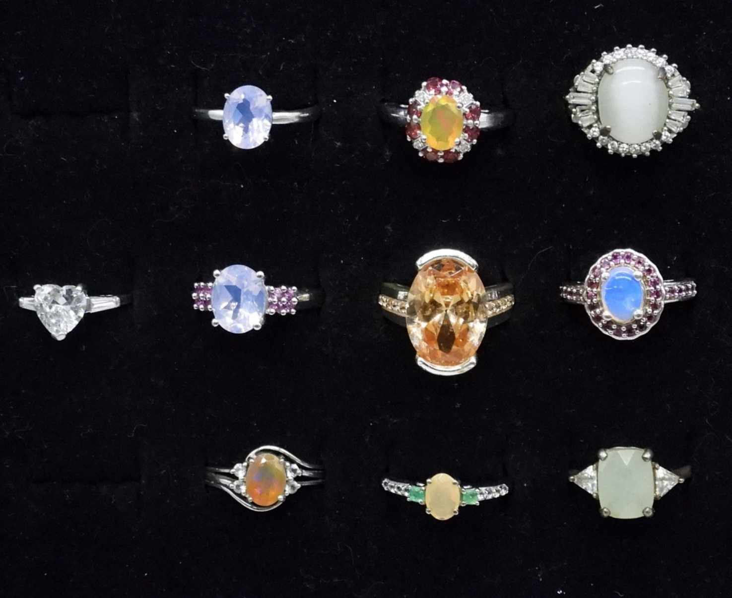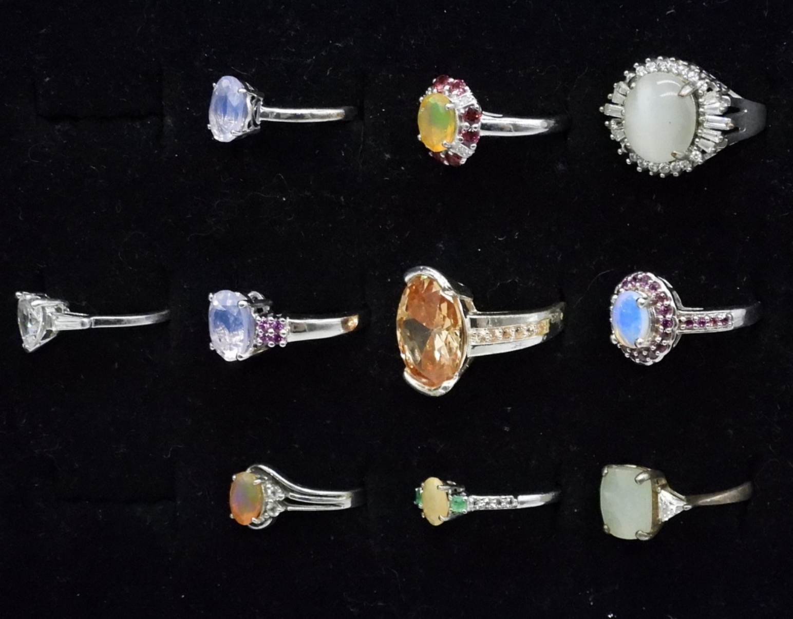 TEN STERLING RINGS, WITH LIGHT COLORED GEMSTONES. SIZES 6-8 (24 DWT)