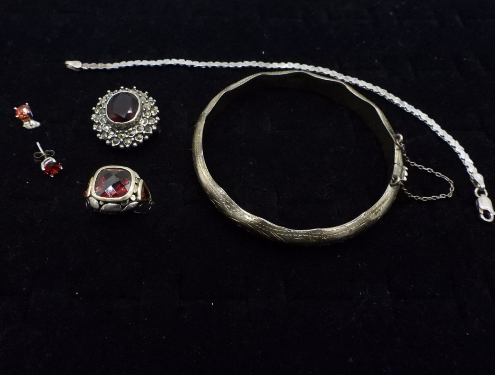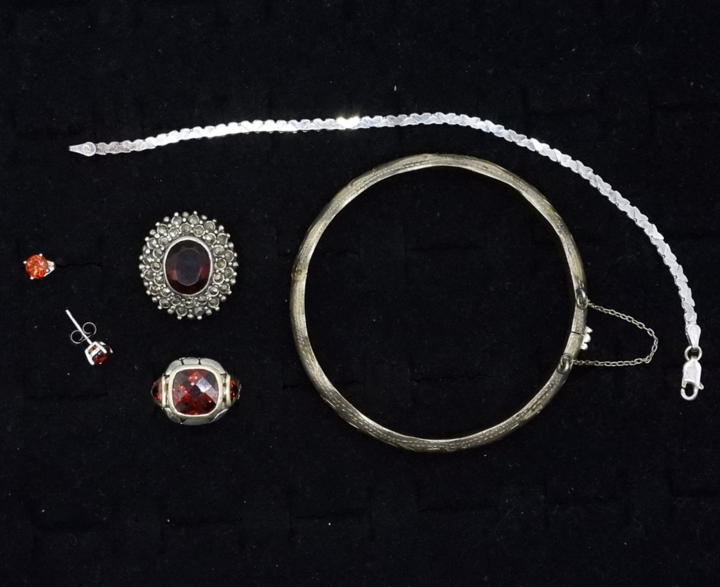 TWO STERLING RINGS WITH REDDISH ORANGE GEMSTONES, SIZES 6 & 8. ONE PAIR OF REDDISH ORANGE POST EARRINGS. TWO BRACELETS, 7 & 8″. (20 DWT)