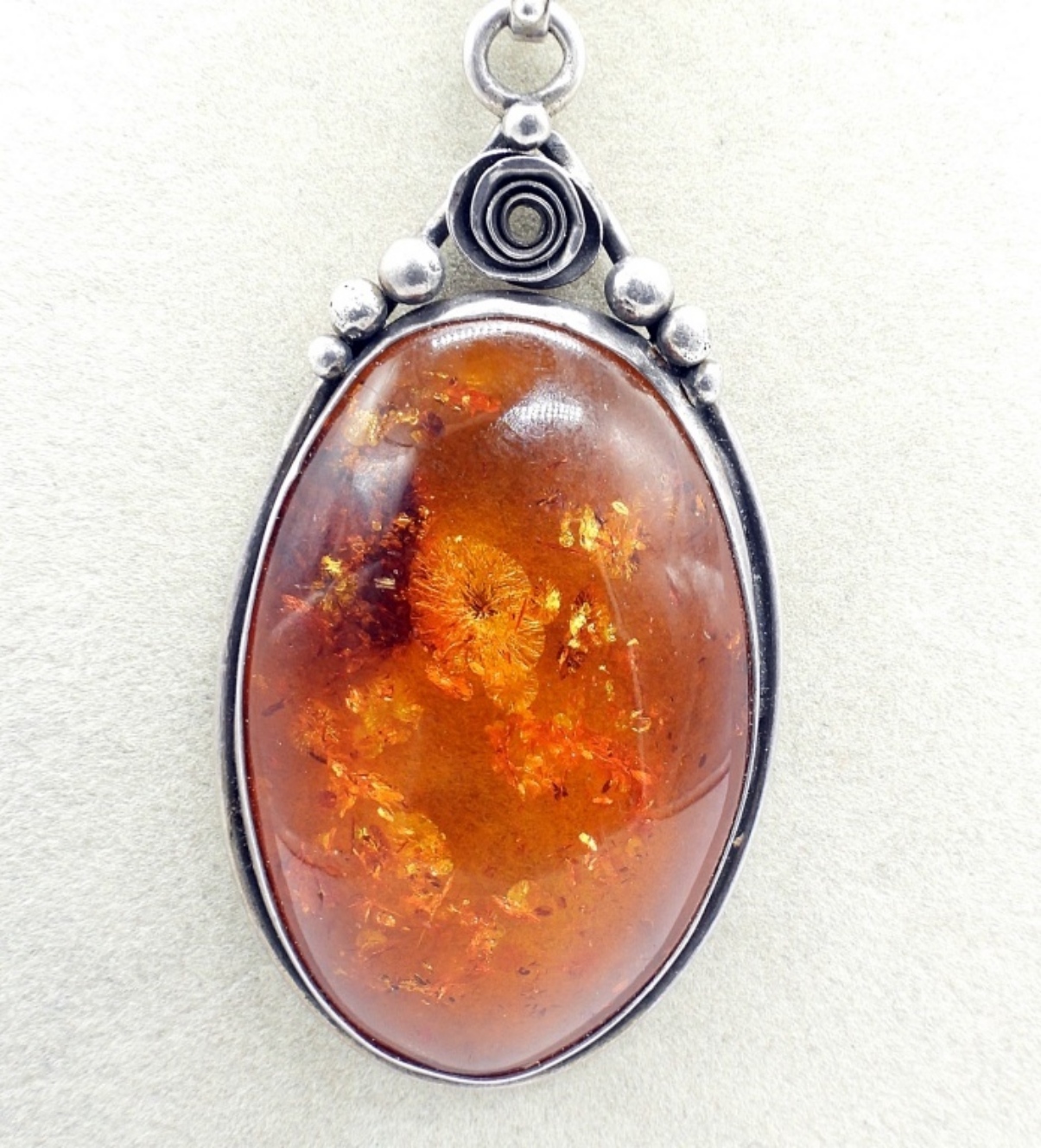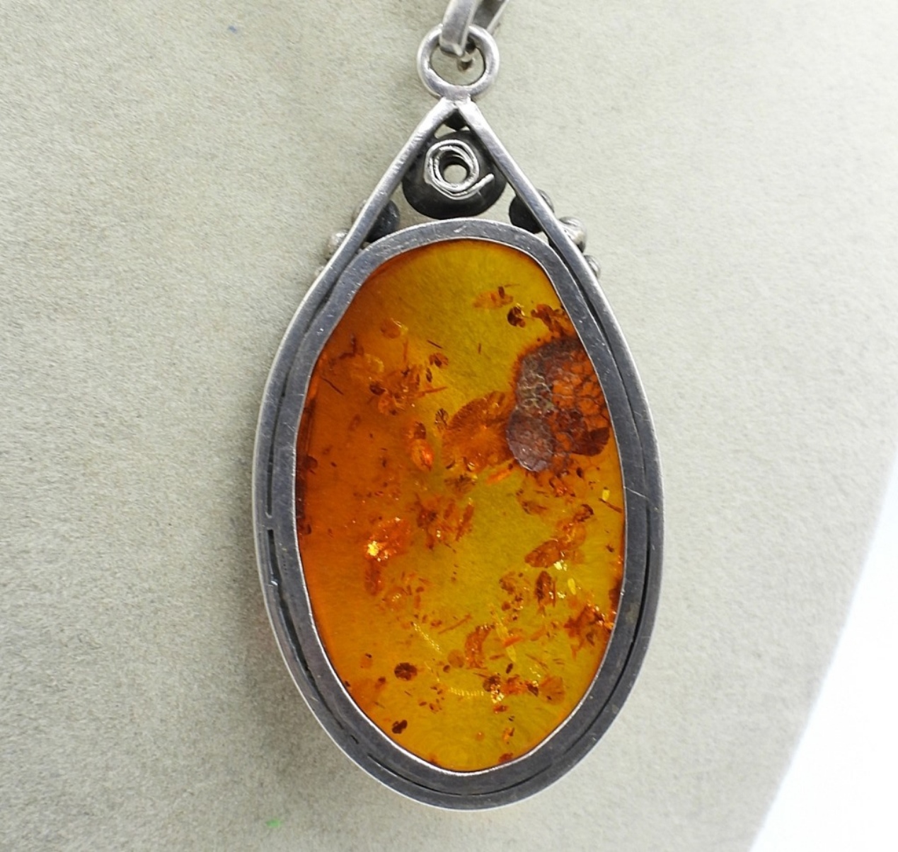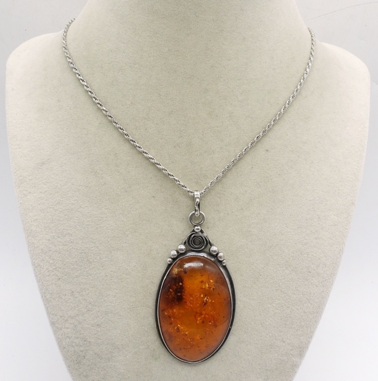 BEAUTIFUL, NATURAL (WITH IMPERFECTIONS) AMBER IN STERLING PENDANT, 3″. STERLING CHAIN IS 36″. (15 DWT)