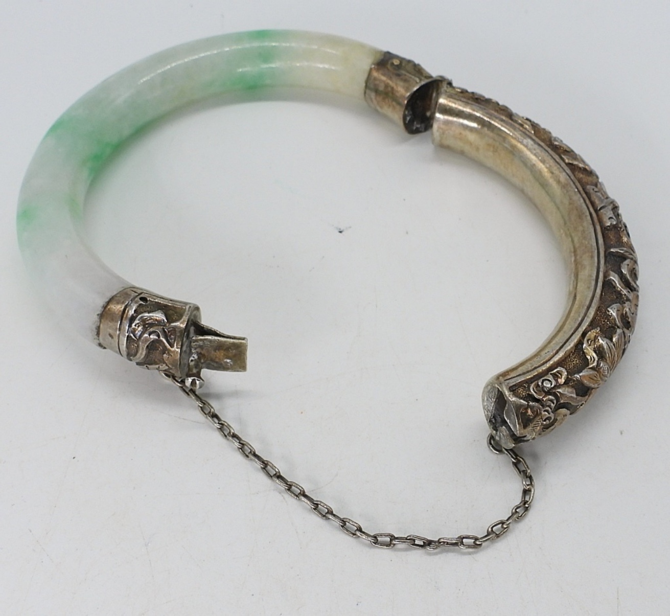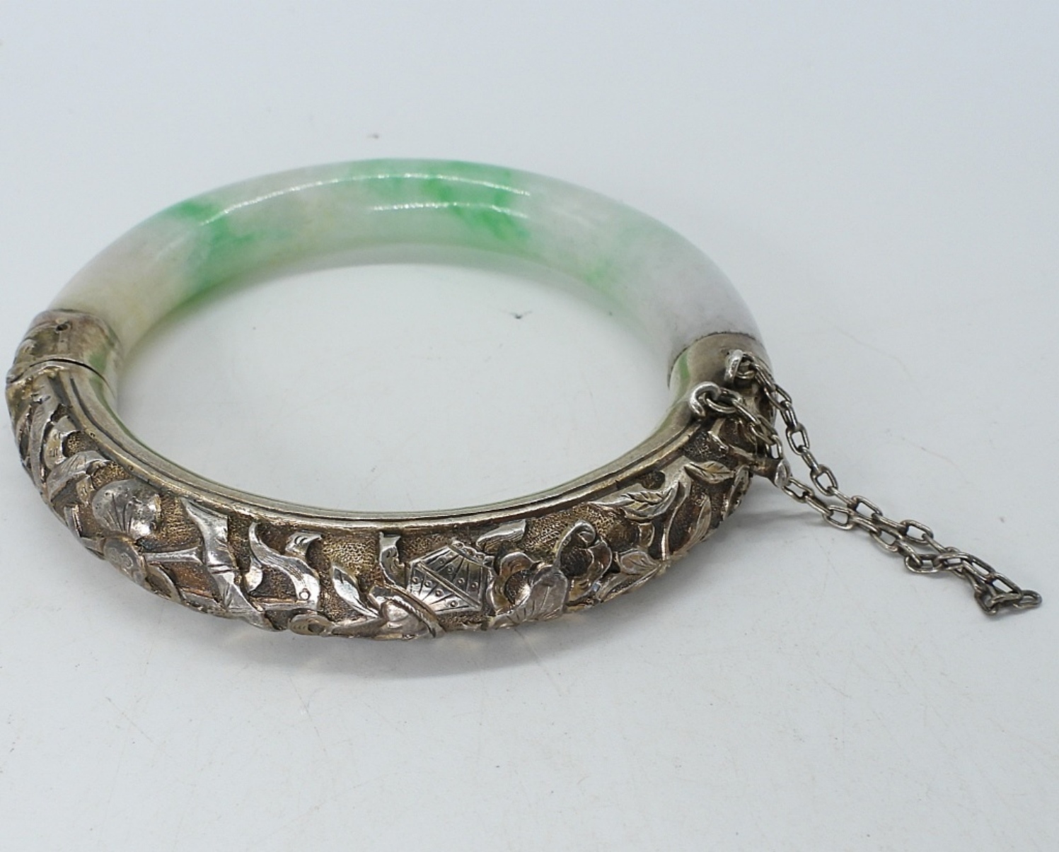 BEAUTIFUL VINTAGE JADEITE & STERLING SILVER HINGED BRACELET. AS THIS IS OLDER, THE STERLING IS A TINY BIT LOOSE. BUT IT IS HOLDING TOGETHER VERY WELL. 6″. (18 DWT)