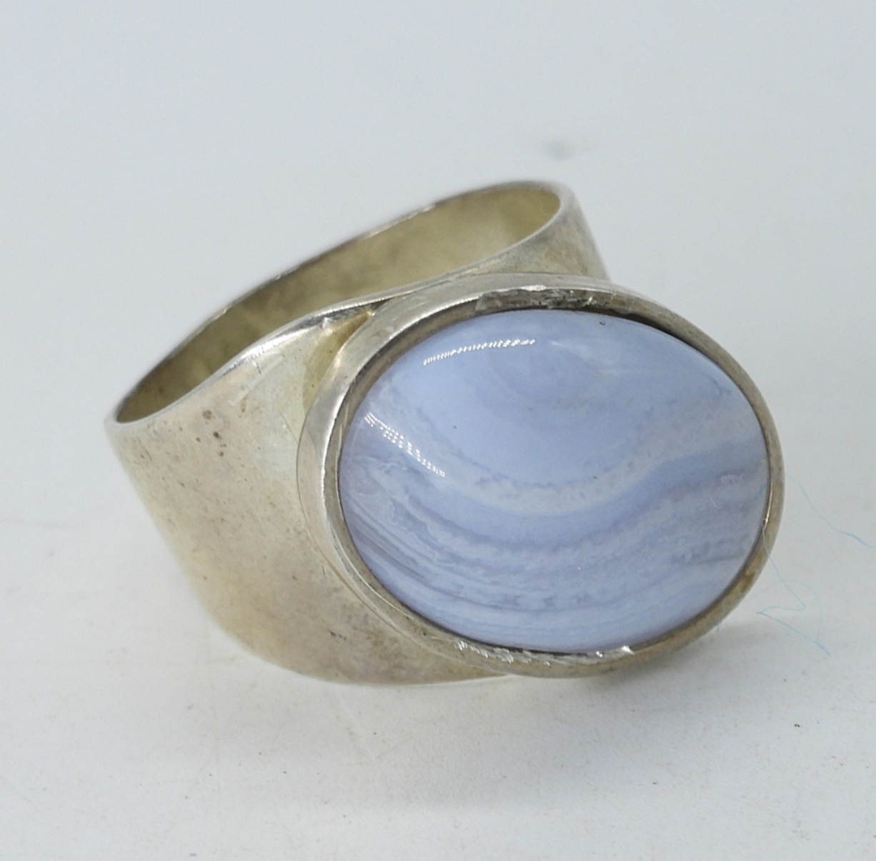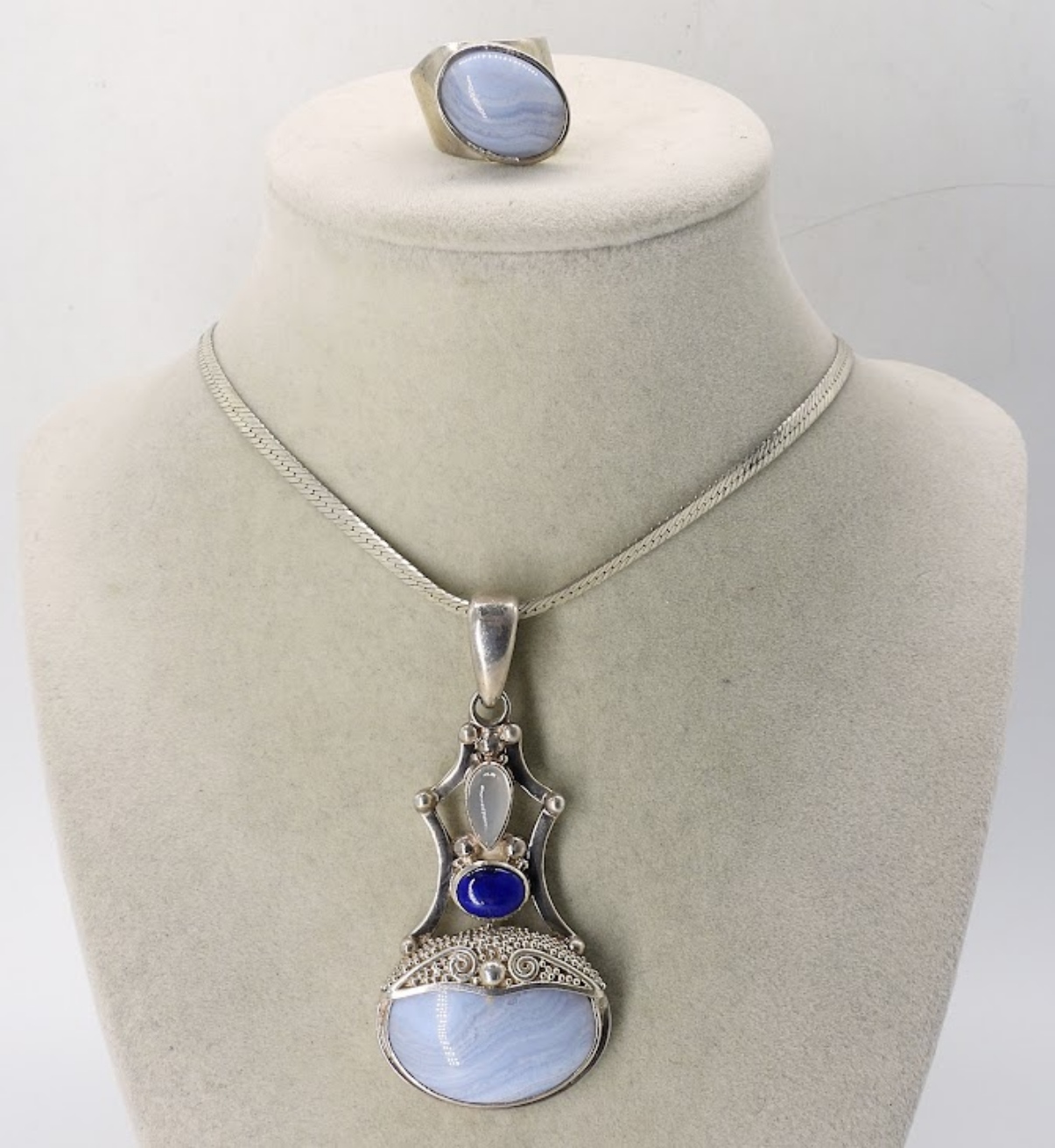 SAJEN BLUE LACE AGATE PENDANT (3″) ON A STERLING CHAIN, 20″. STERLING RING WITH BLUE LACE AGATE GEMSTONE, SIZE 8. (27 DWT)