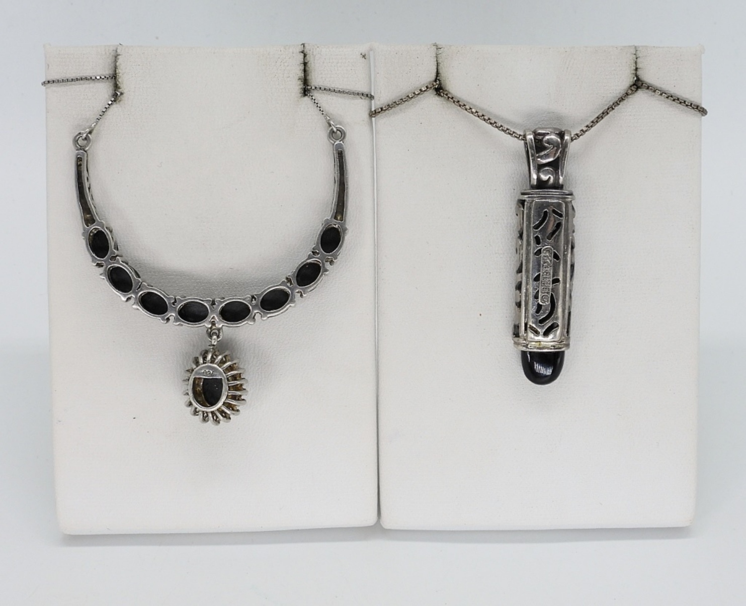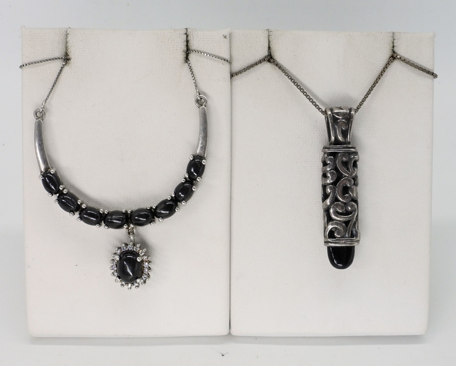 PRETTY STERLING NECKLACE WITH BLACK CATS EYE GEMSTONES, 18″. BLACK ONYX GEMSTONE STERLING NECKLACE, 18″. (13.4 DWT)