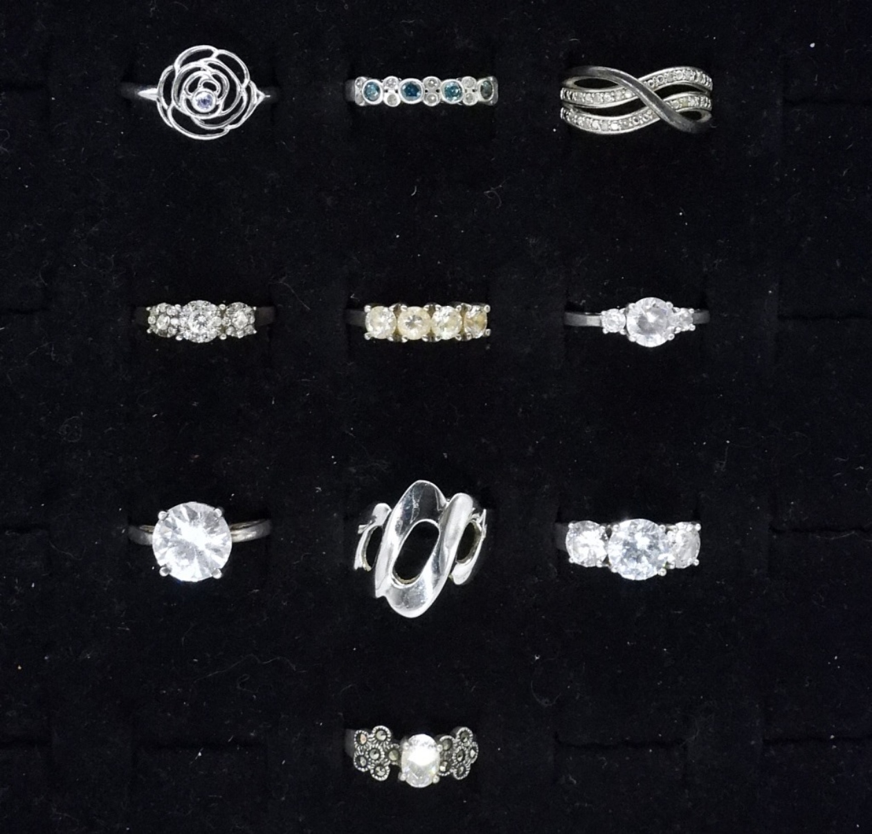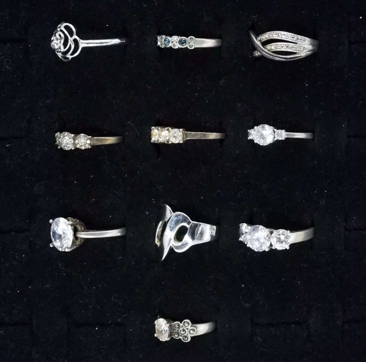 TEN STERLING RINGS, SEVERAL ARE BRIDAL STYLES. SIZES 5.5-9 (19.8 DWT)