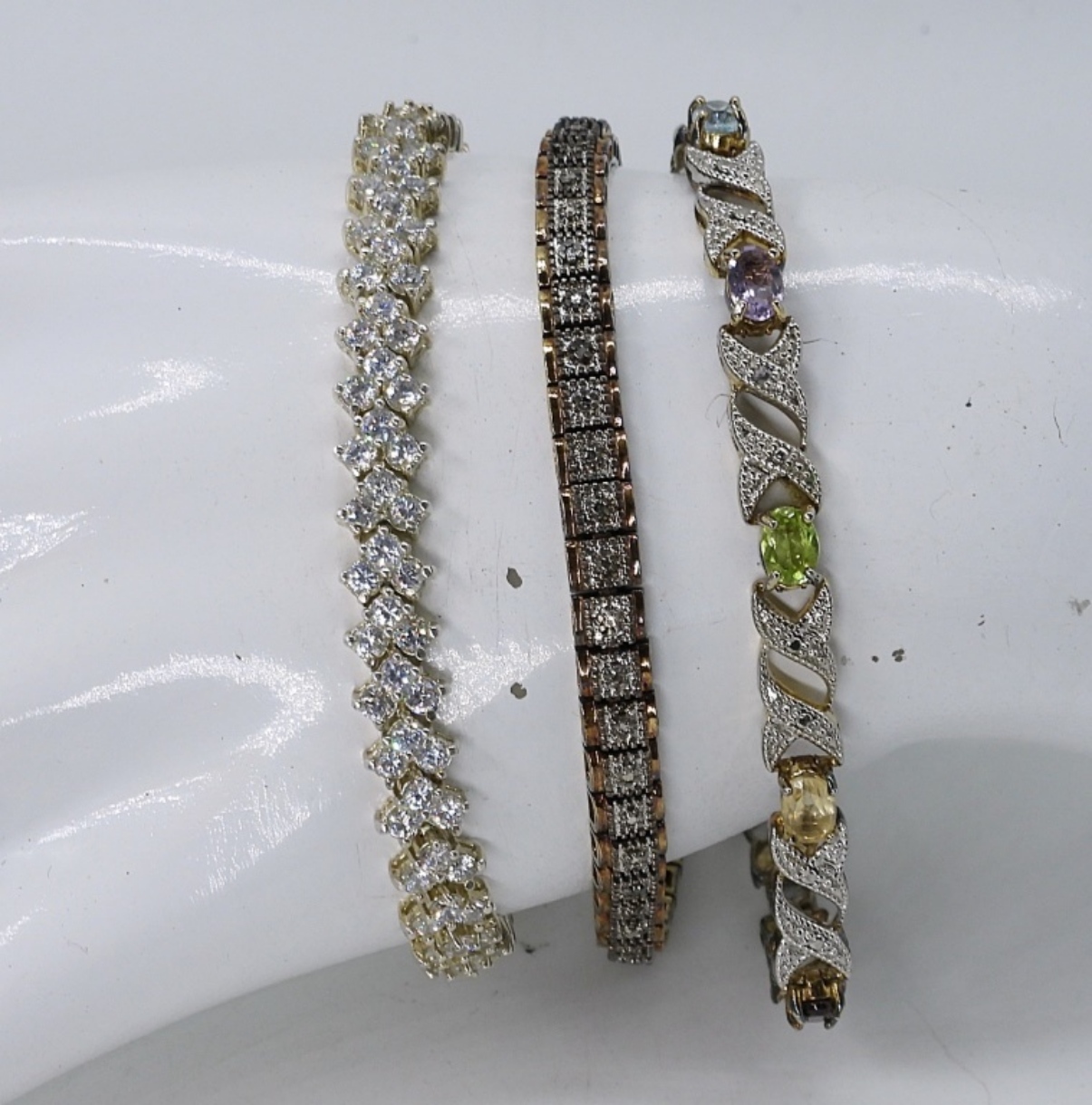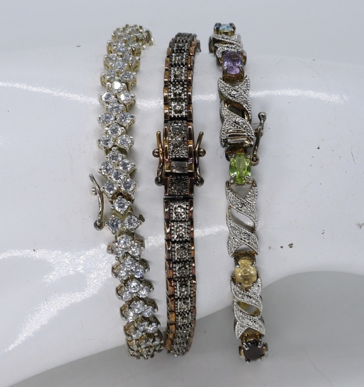 THREE STERLING TENNIS BRACELETS 7-8″. (30 DWT)