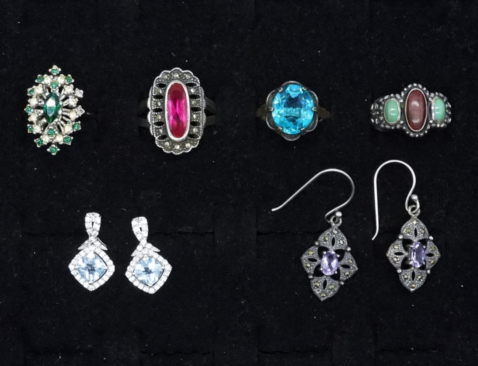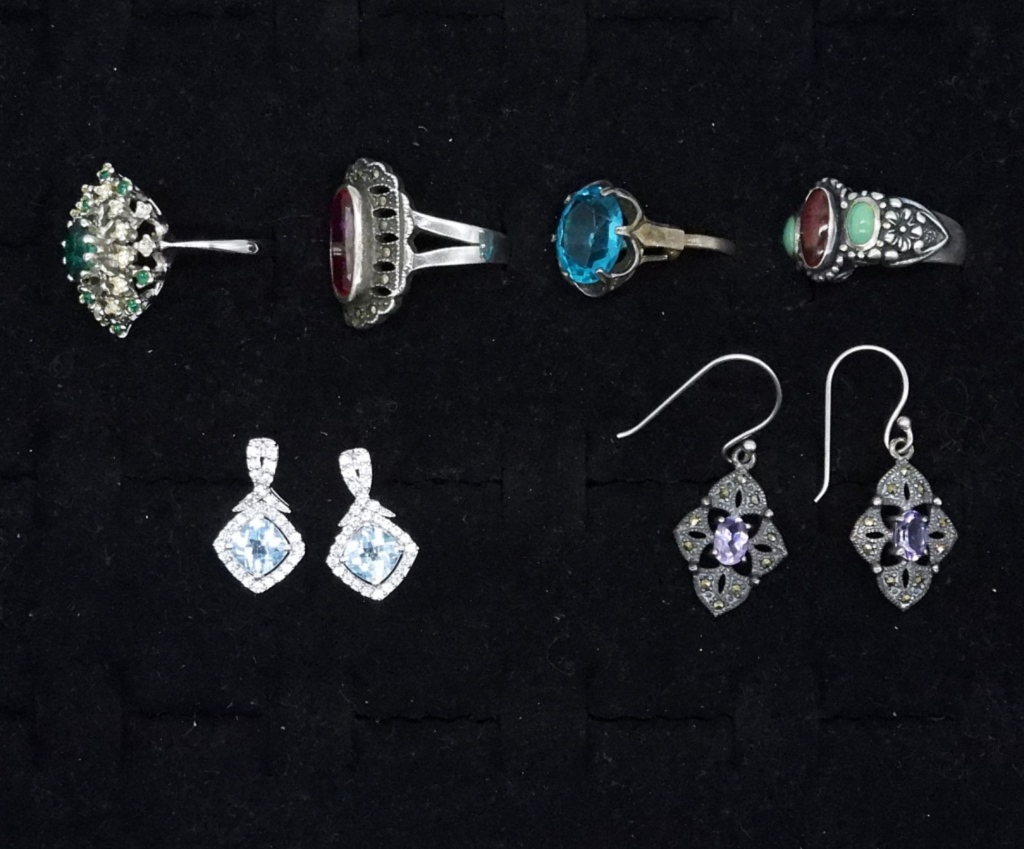 FOUR STERLING GEMSTONE RINGS, SIZES 6-8. TWO PAIR OF STERLING PIERCED EARRINGS. (18.4 DWT)