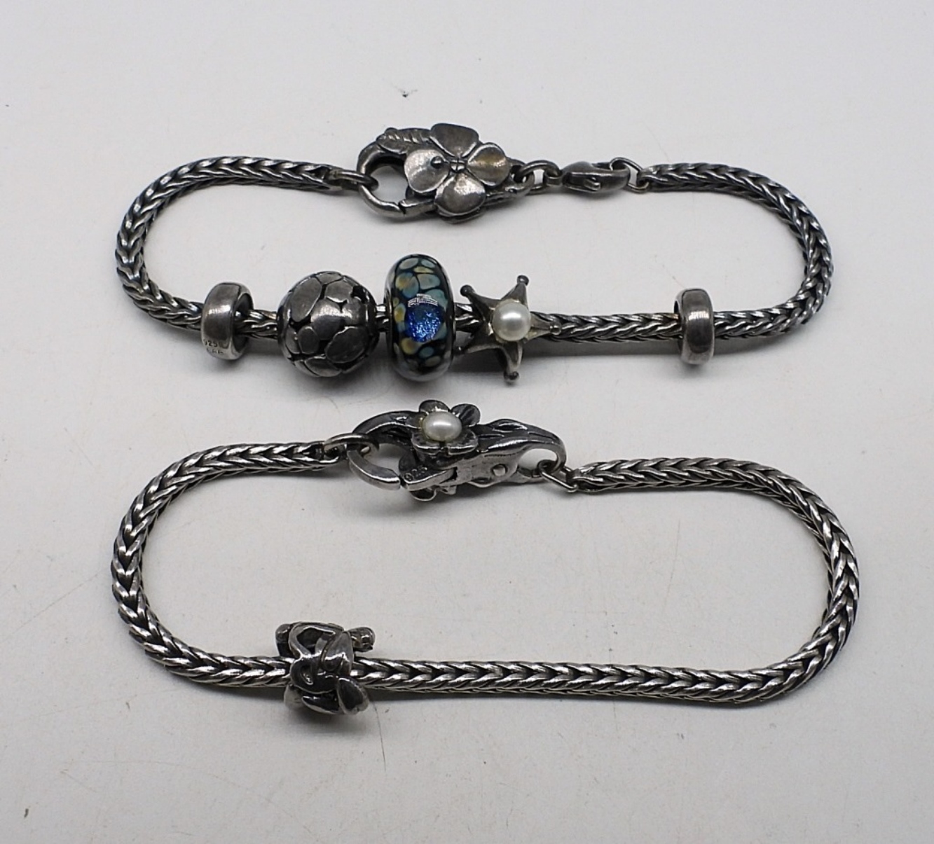 TWO STERLING TROLL BEAD BRACELETS, 8″. 6 BEADS, SOME STERLING & SOME GLASS. (21 DWT)