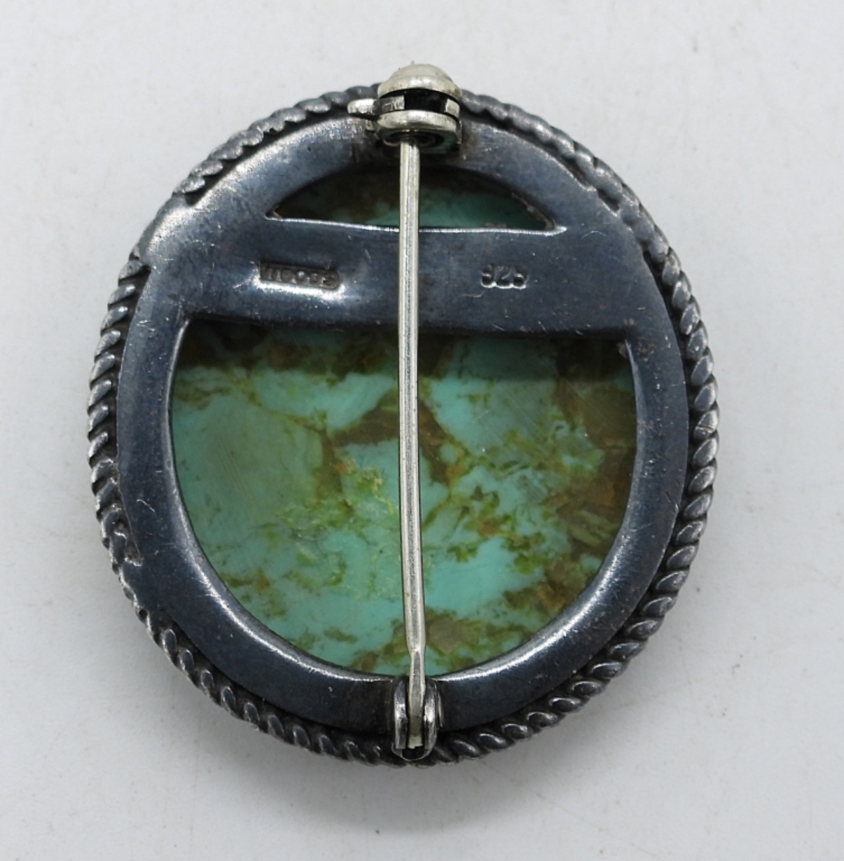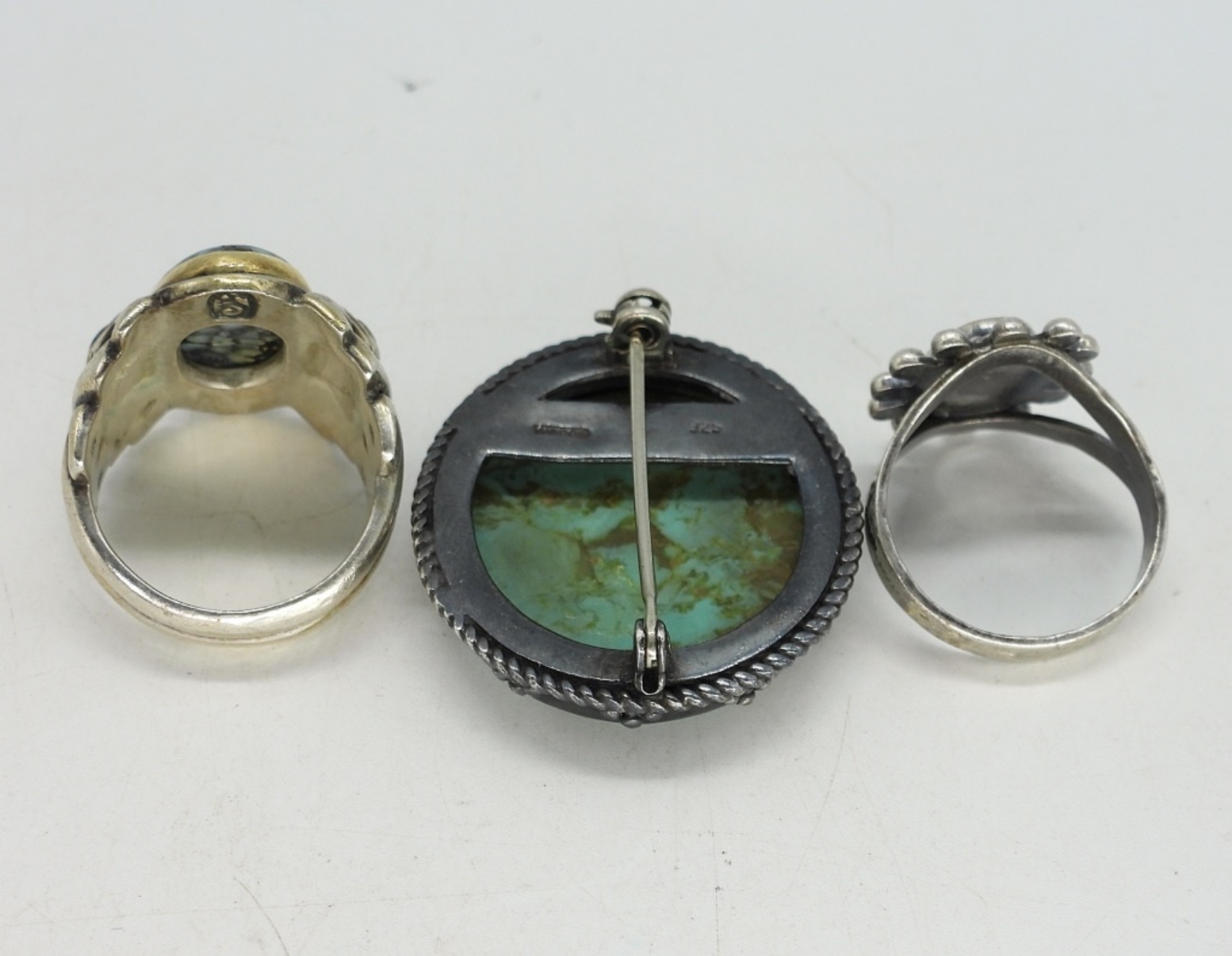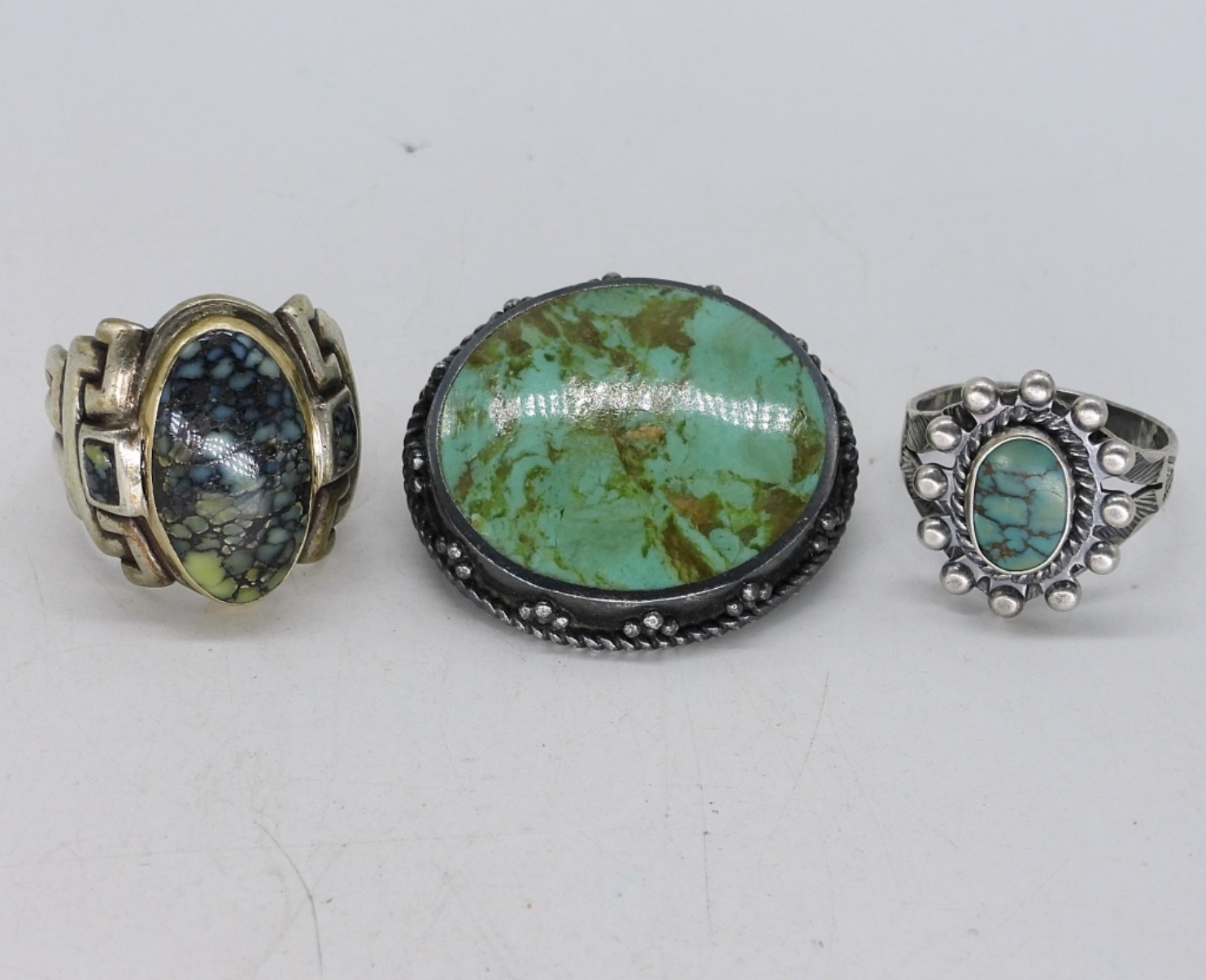 TWO BEAUTIFUL STERLING RINGS WITH TURQUOISE, SIZES 7/8. STERLING TURQUOISE VINTAGE BROOCH. (18.41 DWT)