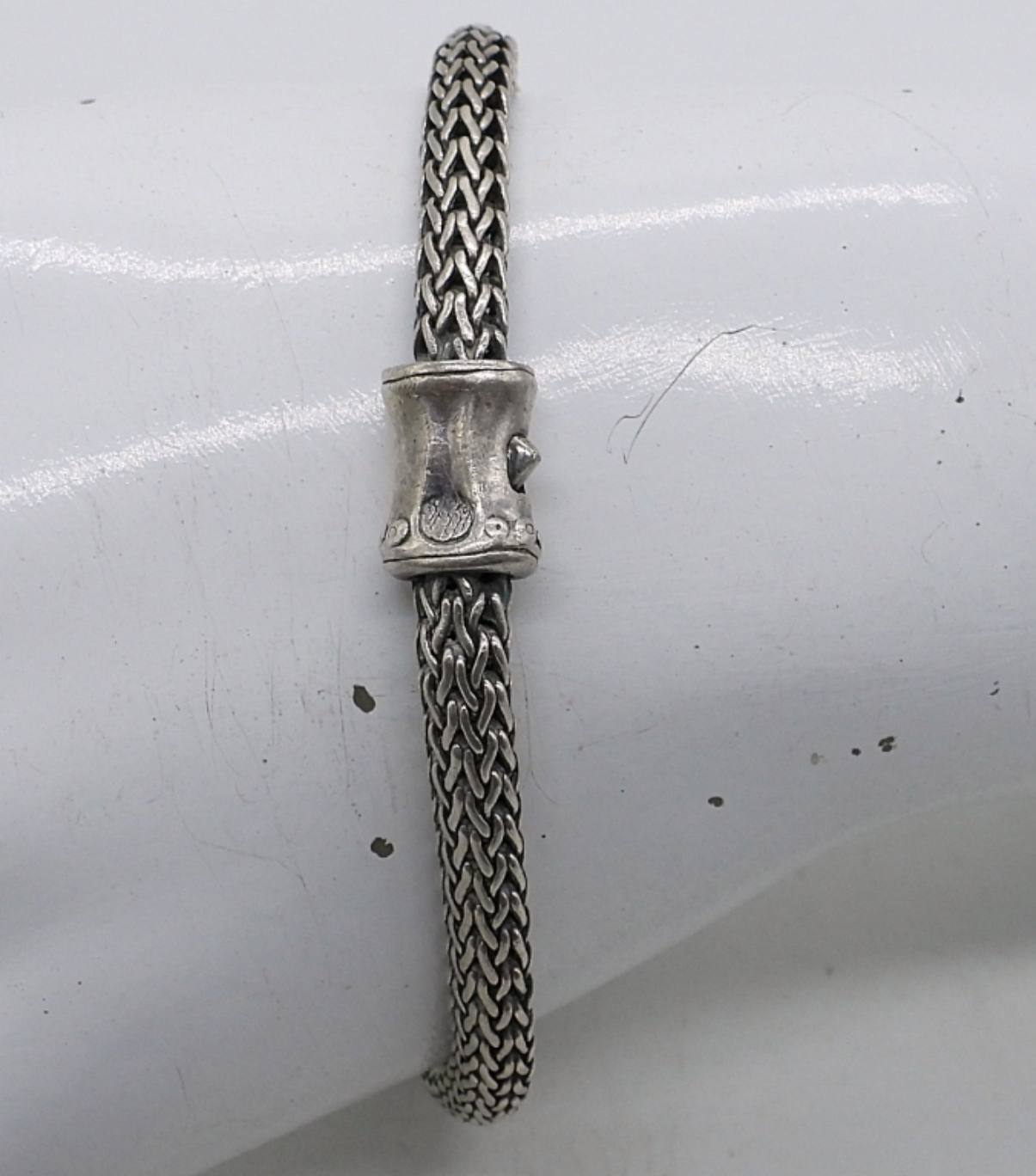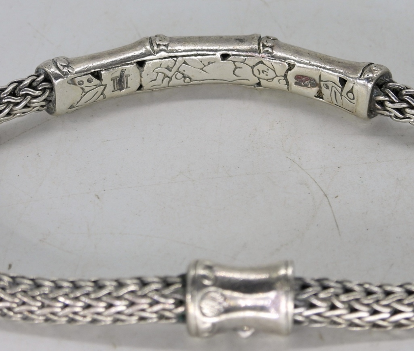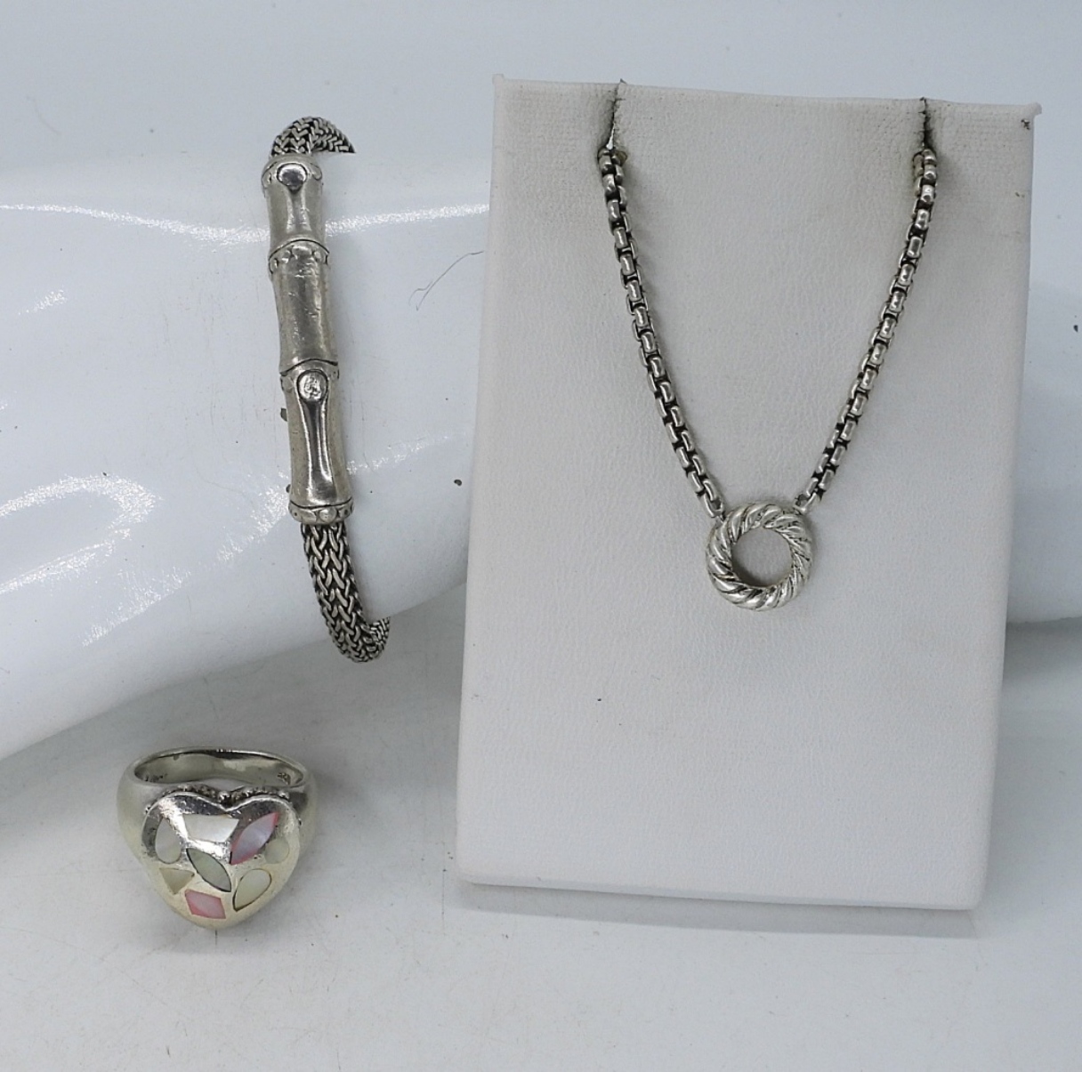 VINTAGE STERLING JOHN HARDY BAMBOO BRACELET, 7.5″. NECKLACE IS 16″. RING IS SIZE 8. (27.7 DWT)