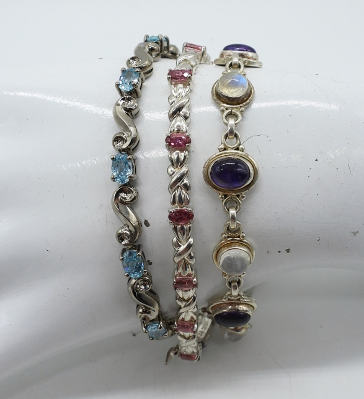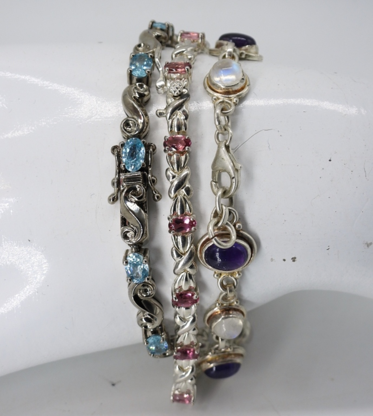 THREE GEMSTONE BRACELETS IN STERLING SILVER, 8″. (27 DWT)