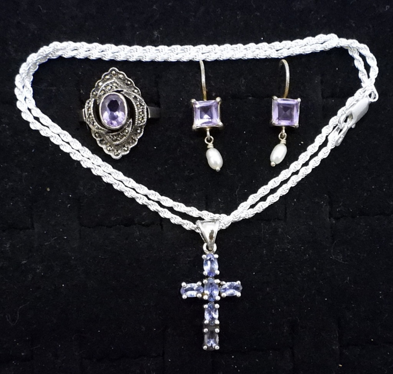 NECKLACE, 16″. RING SIZE 8. PIERCED AMETHYST / PEARL EARRINGS. (8.7 DWT)