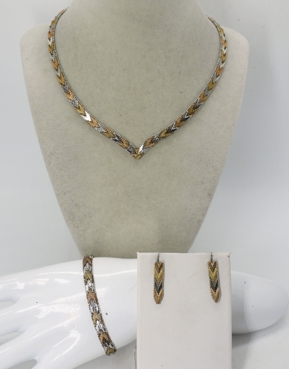 VINTAGE TRI TONE 3 PIECE SET – STERLING. NECKLACE 16″. BRACELET 7″ & PIERCED EARRINGS. 31.4 DWT