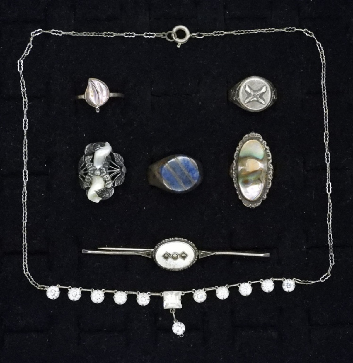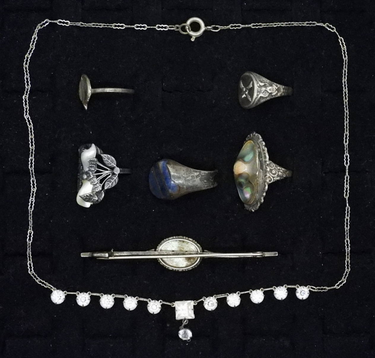 5 RINGS, SIZES 5-8. ONE BAND IS CUT, ONE BAND IS MISSHAPEN. NECKLACE IS 16″. MOTHER OF PEARL / MARCASITE PIN, 3″. (20 DWT)