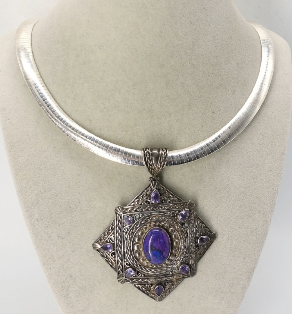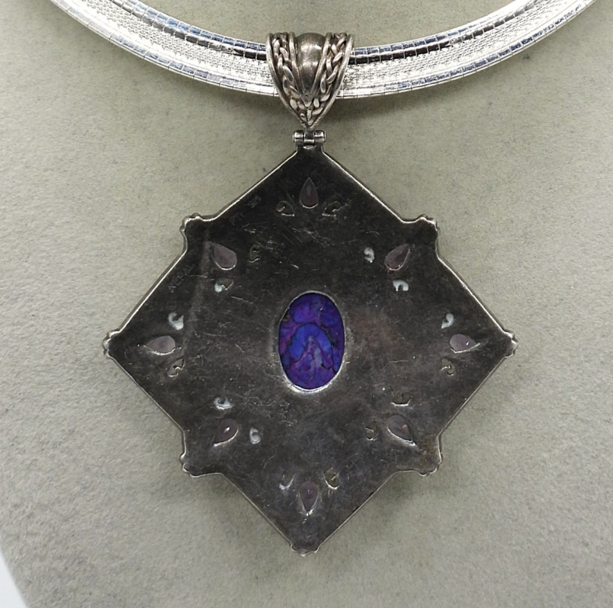 VINTAGE NEPAL 925 PENDANT WITH PRETTY PURPLE GEMSTONES. PENDANT IS 3″. STERLING CHAIN IS 14″. (45 DWT)
