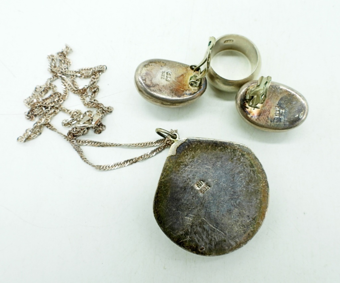 VINTAGE STERLING SHELL PENDANT 2″ ON A 24″ STERLING CHAIN. VINTAGE CLIP ON EARRINGS AND A PLAIN, THICK BAND SIZE 8. 27.2 DWT