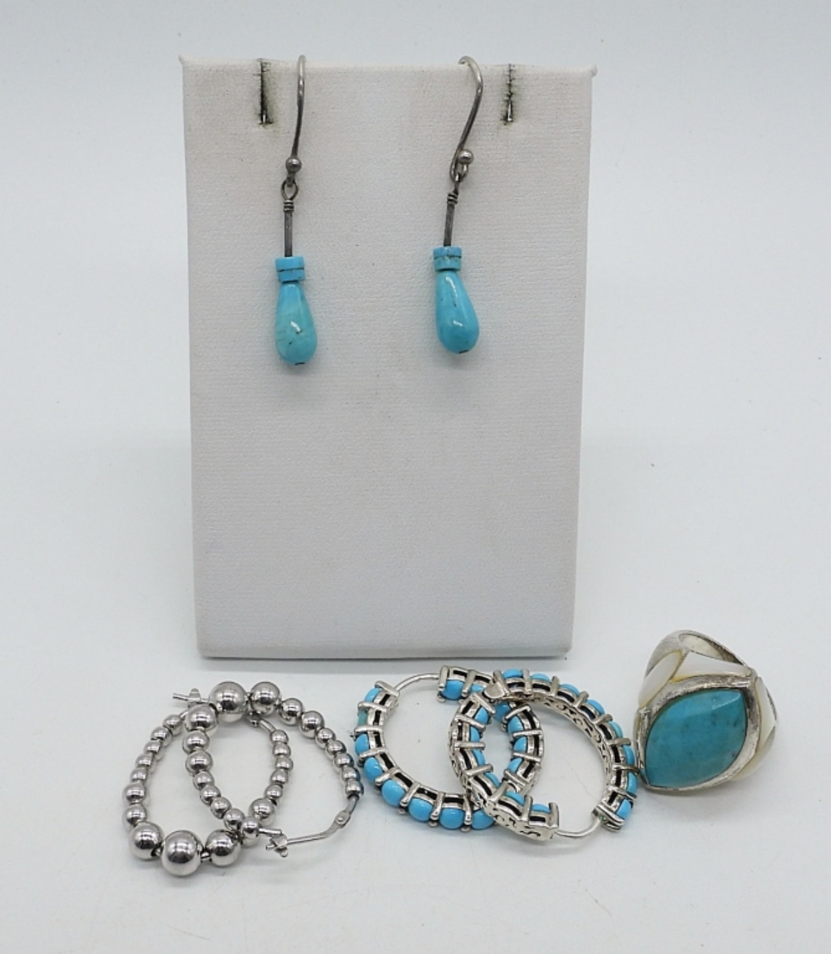 TURQUOISE & MOTHER OF PEARL STERLING RING, SIZE 8. THREE PAIR OF PIERCED EARRINGS. (16.3 DWT)