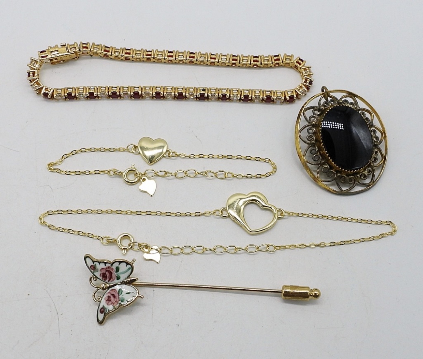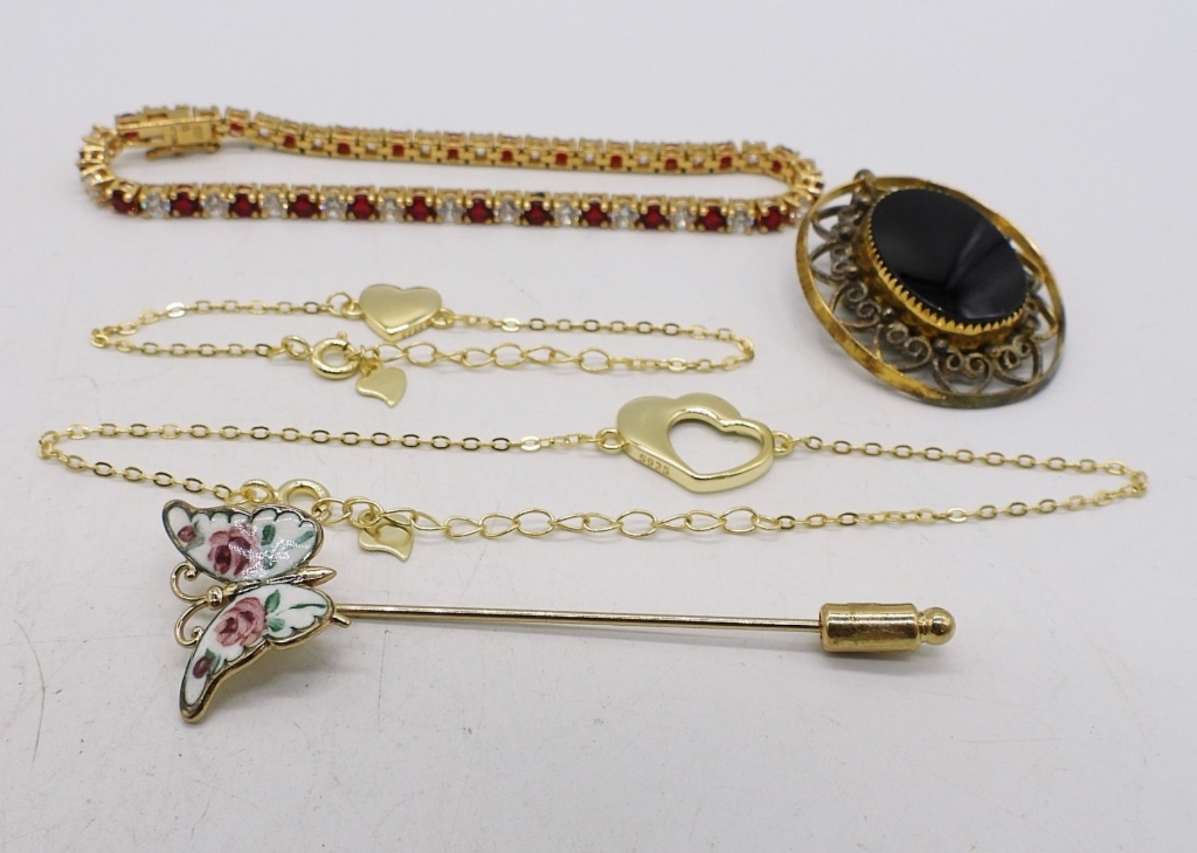 THREE STERLING GOLD TONE BRACELETS, 5″-8″. BUTTERFLY PIN, ONYX PIN / BROOCH. (13.7 DWT)
