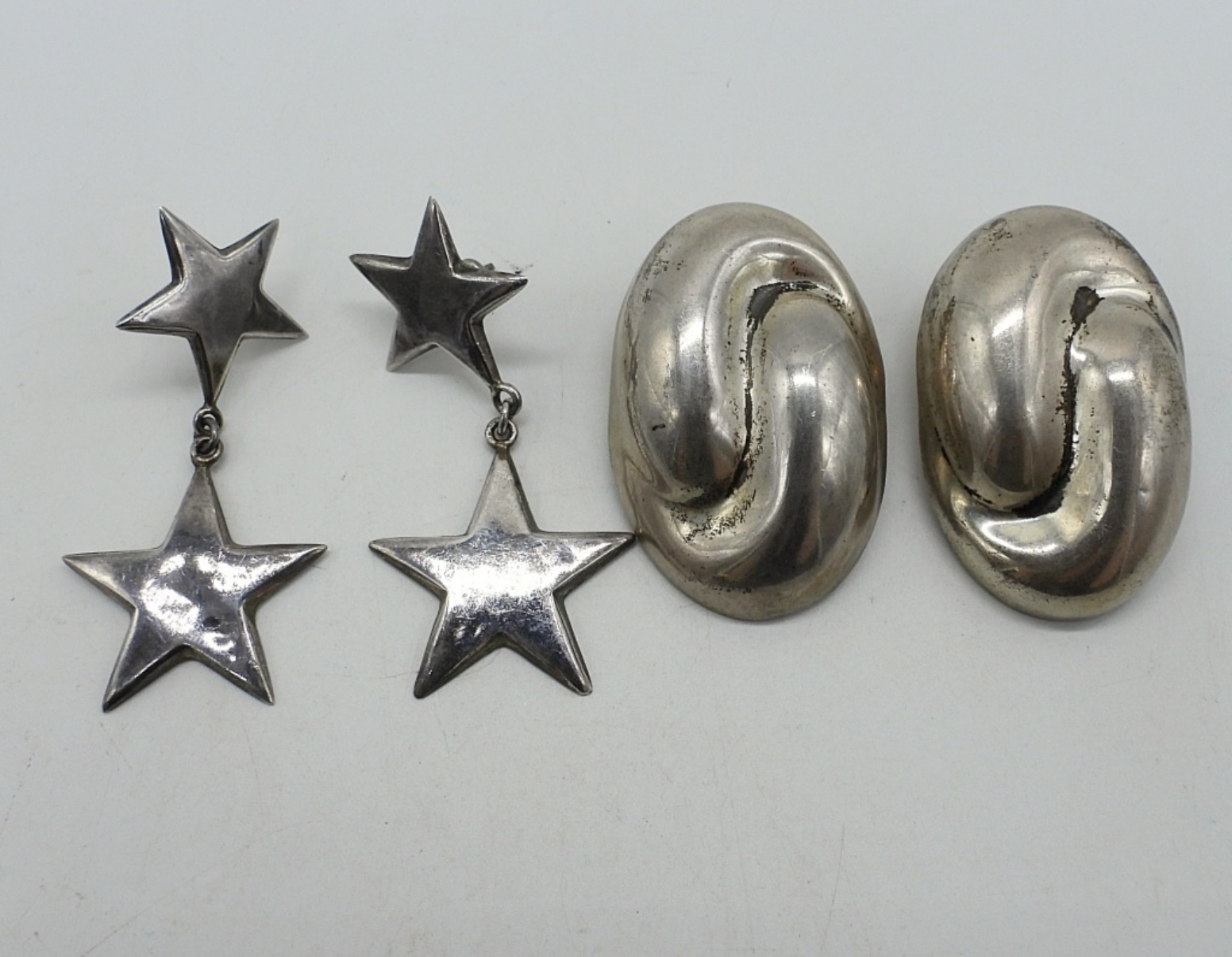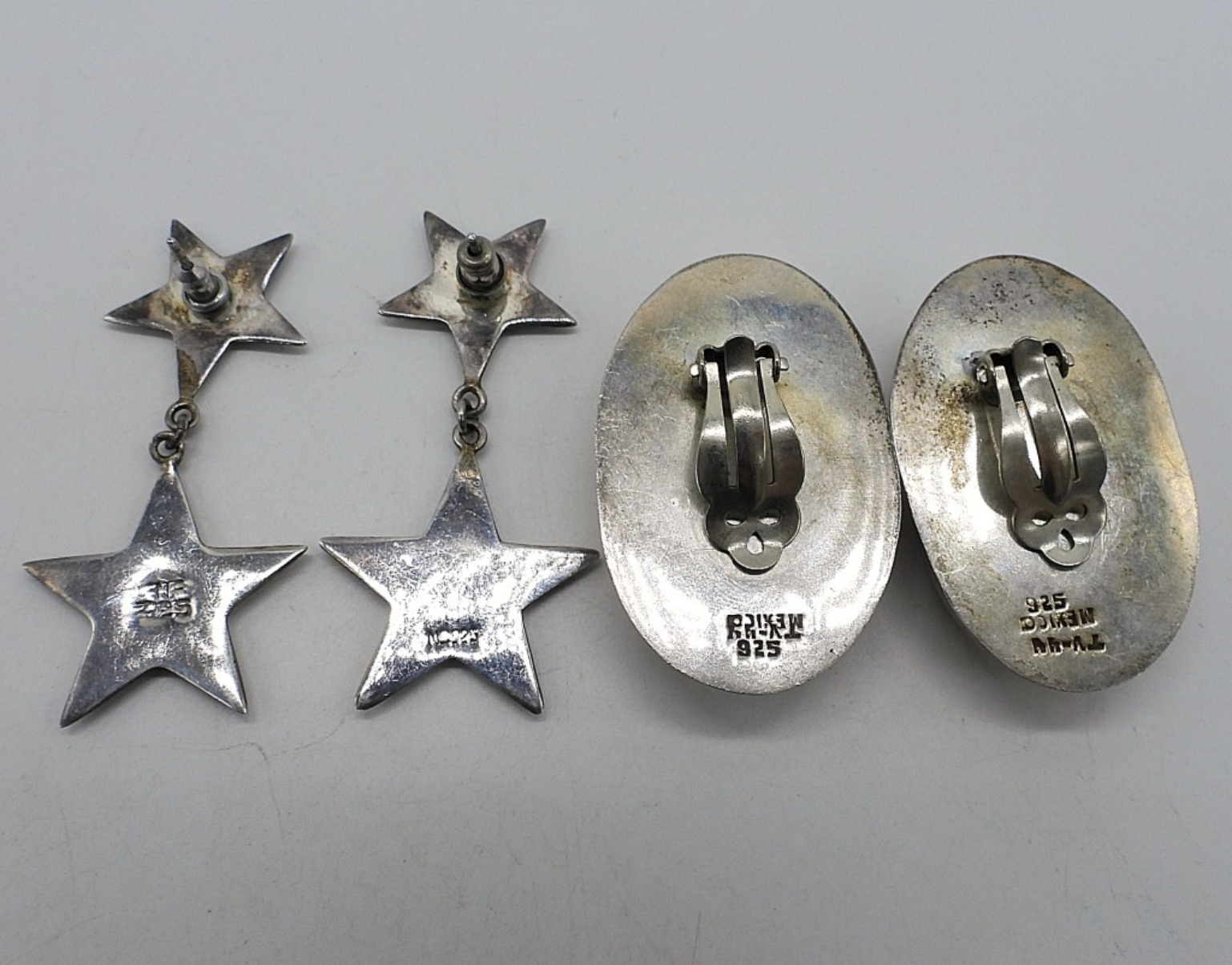 ONE PAIR OF CLIP ON STERLING EARRINGS, TAXCO MARKED “TV-44 MEXICO 925”. ONE PAIR OF PIERCED STAR EARRINGS (NOT TAXCO), MARKED “NF 925”. (23.3 DWT)
