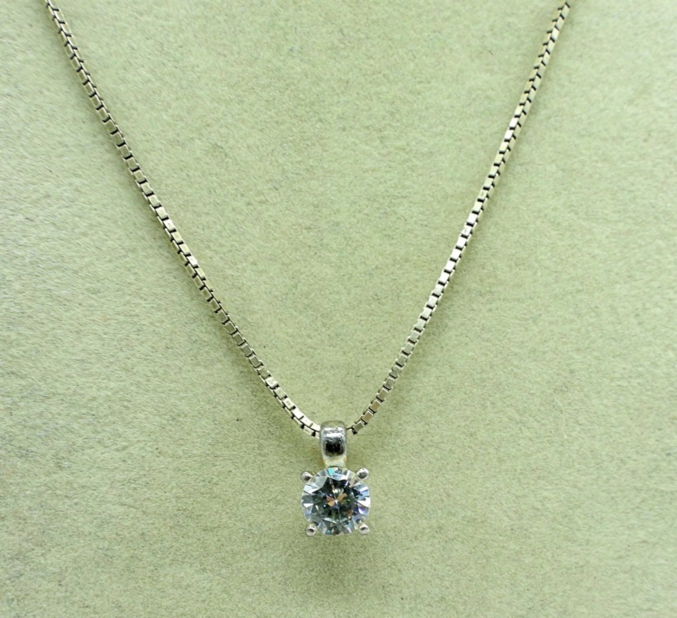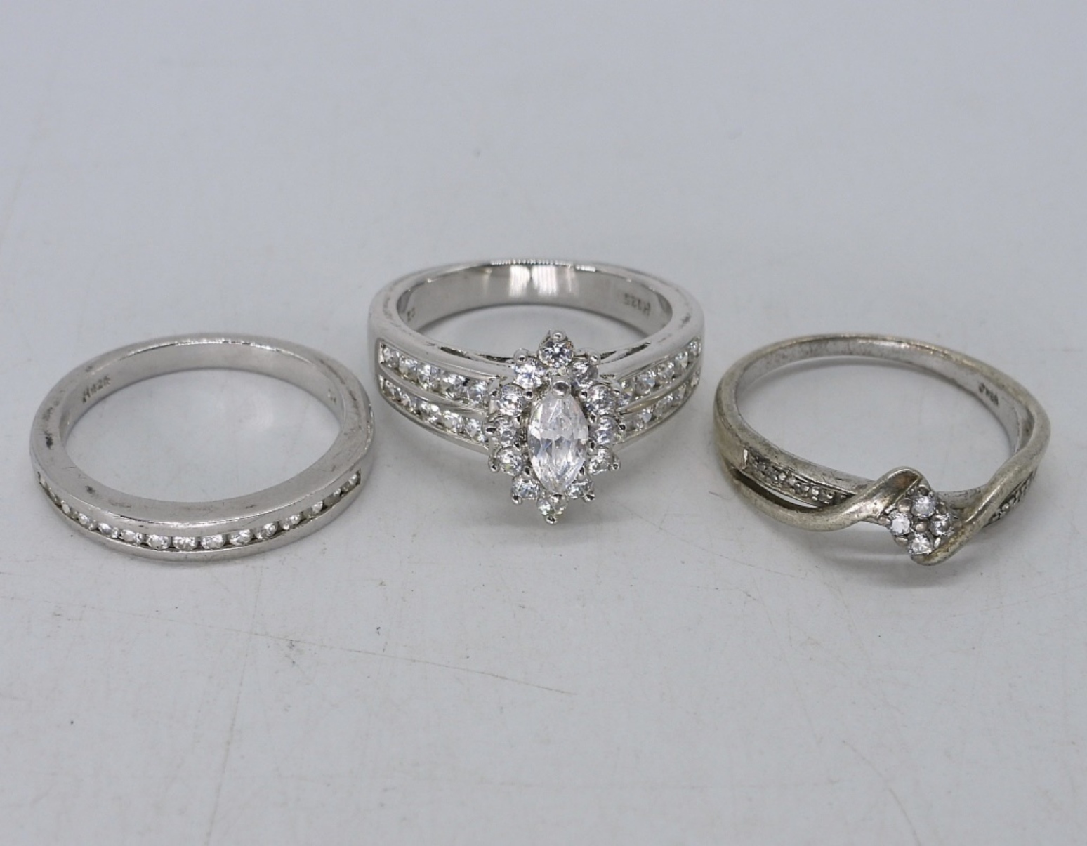 THREE STERLING RINGS. ONE HAS FOUR SMALL GENUINE DIAMONDS ON TOP. ALL SIZED 7. 3 PAIR OF PIERCED EARRINGS. ONE NECKLACE, 18″. 13.6 DWT
