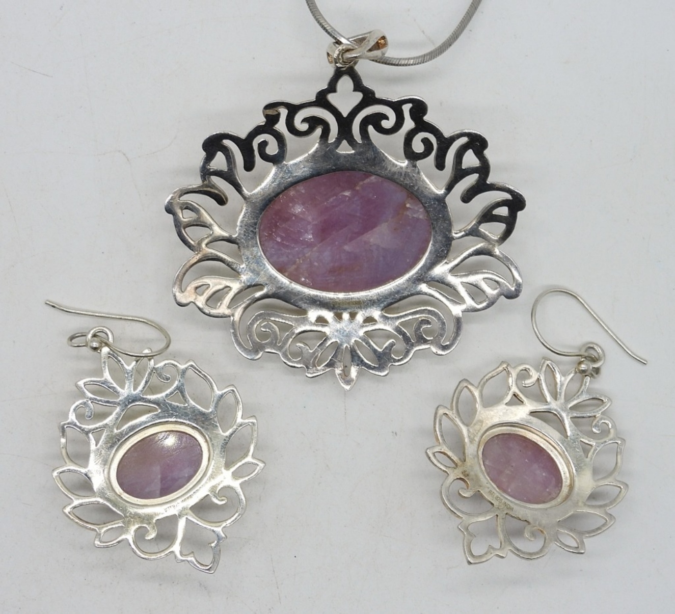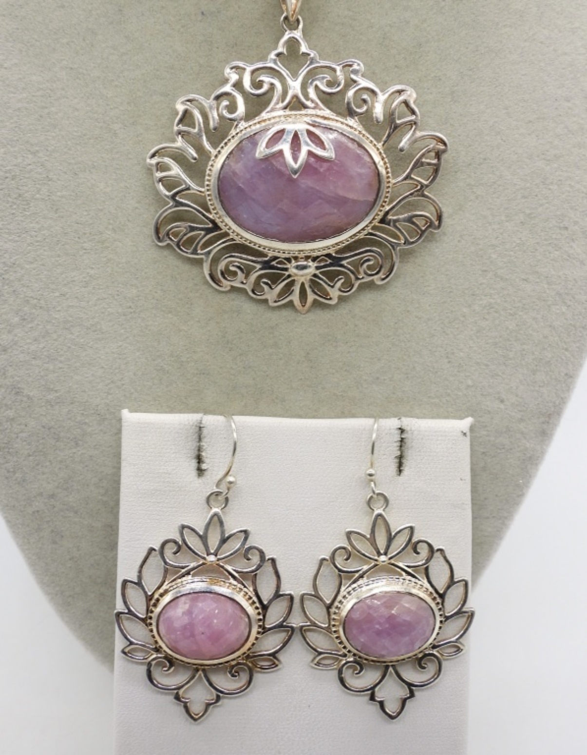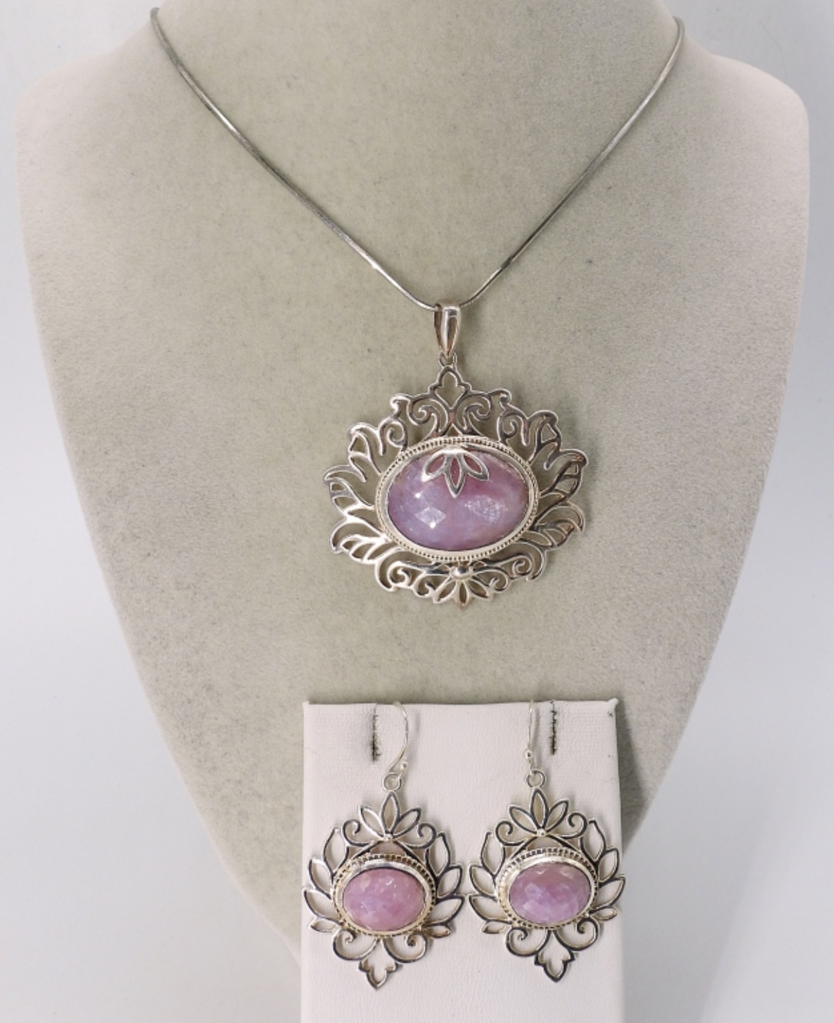 STERLING NATURAL PINK GEMSTONE NECKLACE, 18″ & PIERCED EARRINGS 2″. (20 DWT)