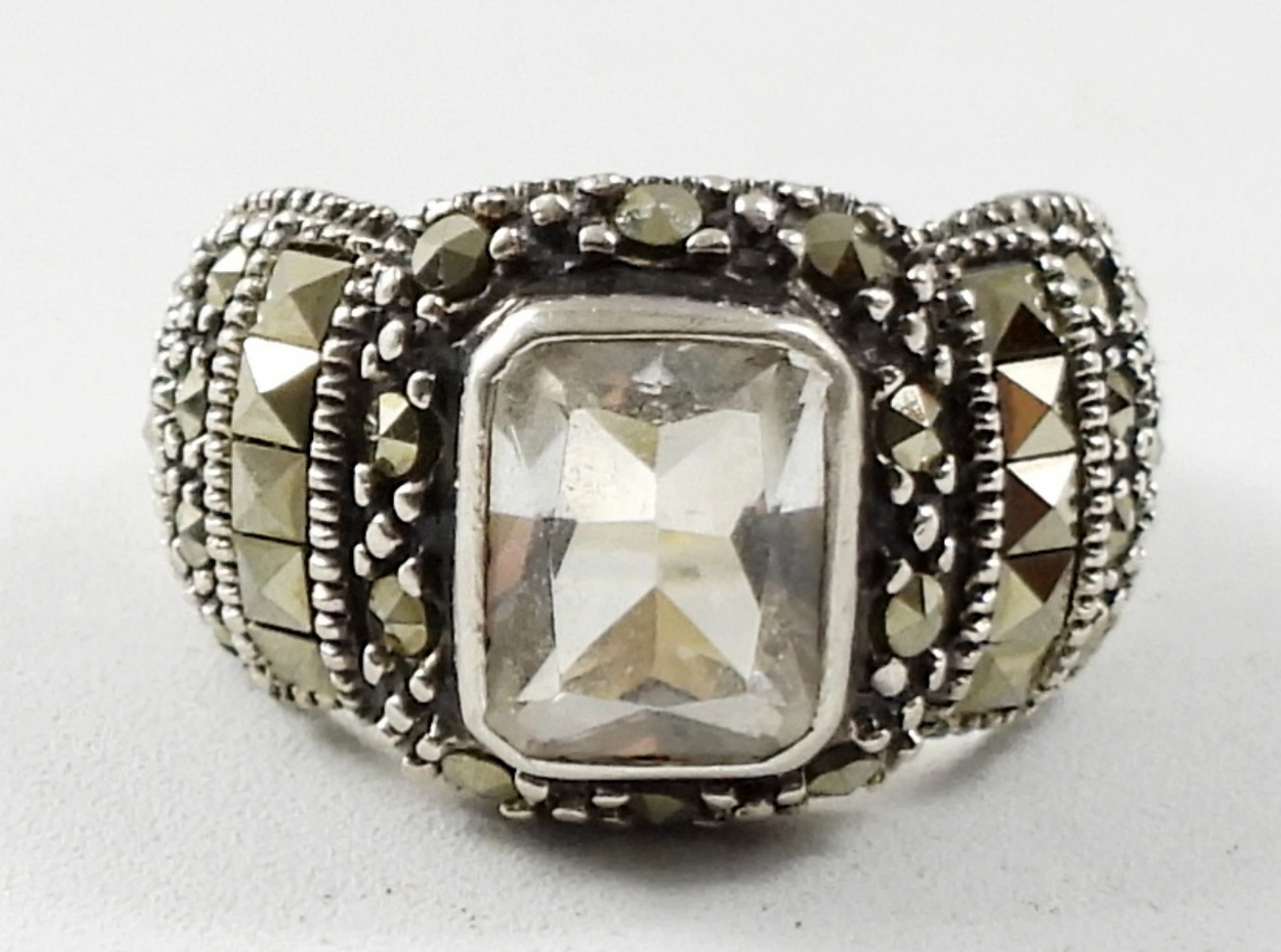 24″ NECKLACE AND PENDANT WITH ONYX STONE , A SIZE 8 RING WITH CLEAR GEMSTONE AND A 6″ MULTI STRAND BRACELET (59.6 DWT)