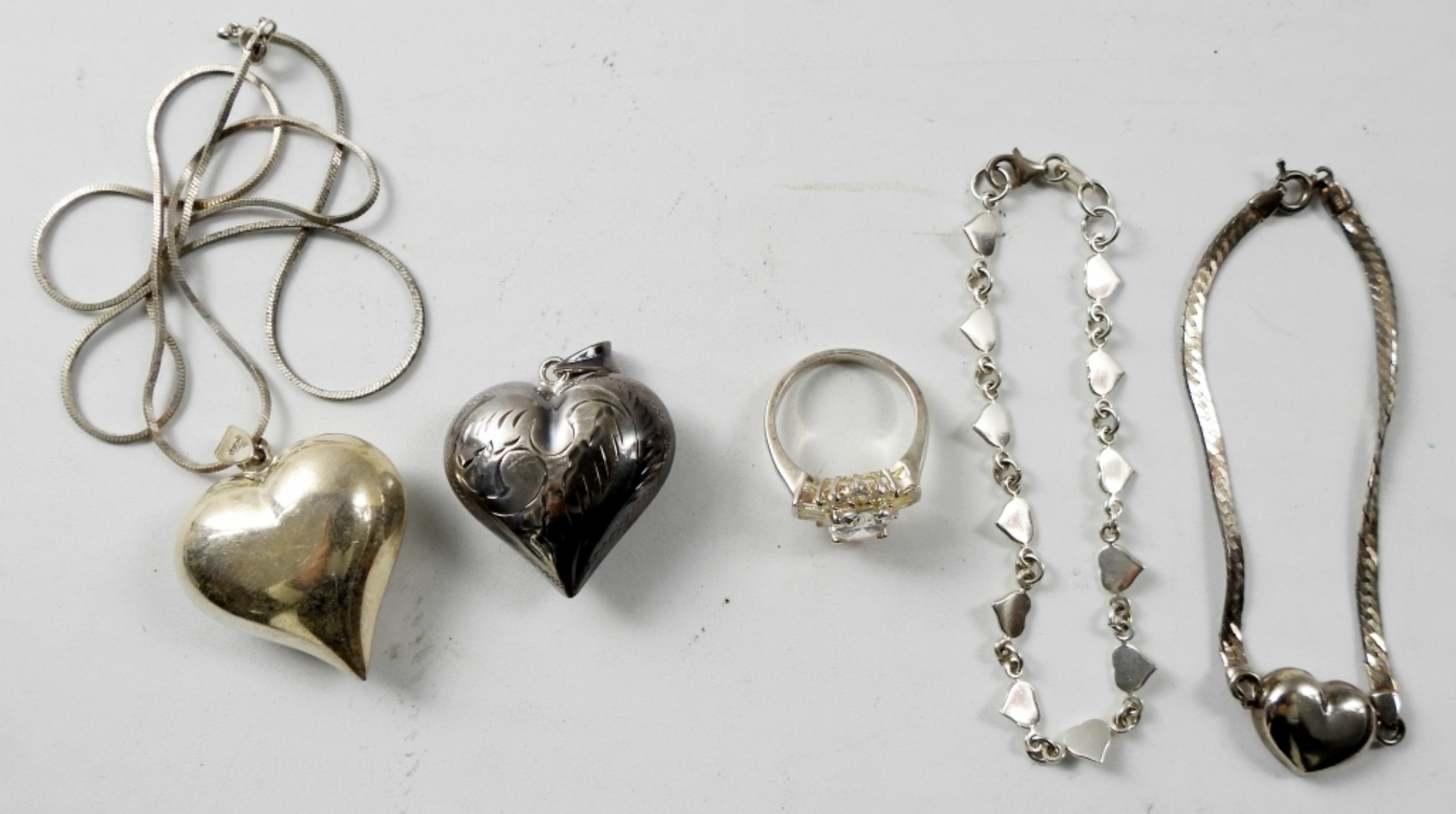 18″ STERLING NECKLACE WITH 2 925 HEART PENDANTS A SIZE 8 RING WITH DIAMOND LIKE STONES AND 2 925 HEART BRACELETS (22.2 DWT )