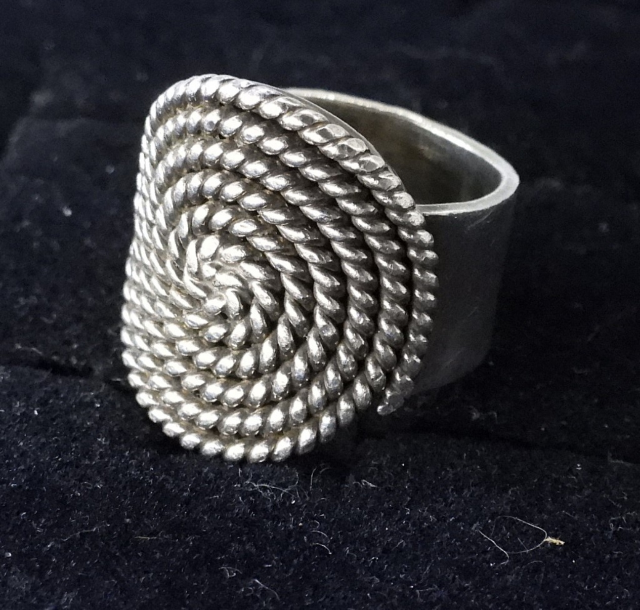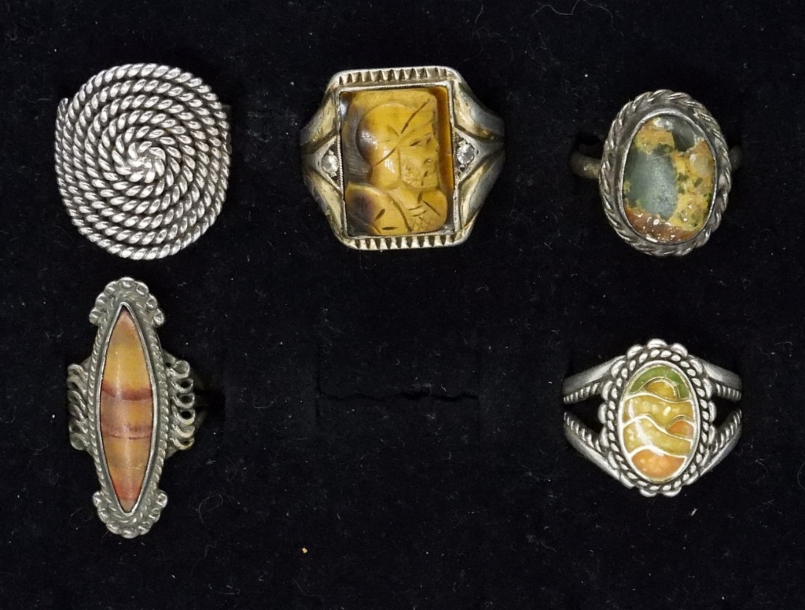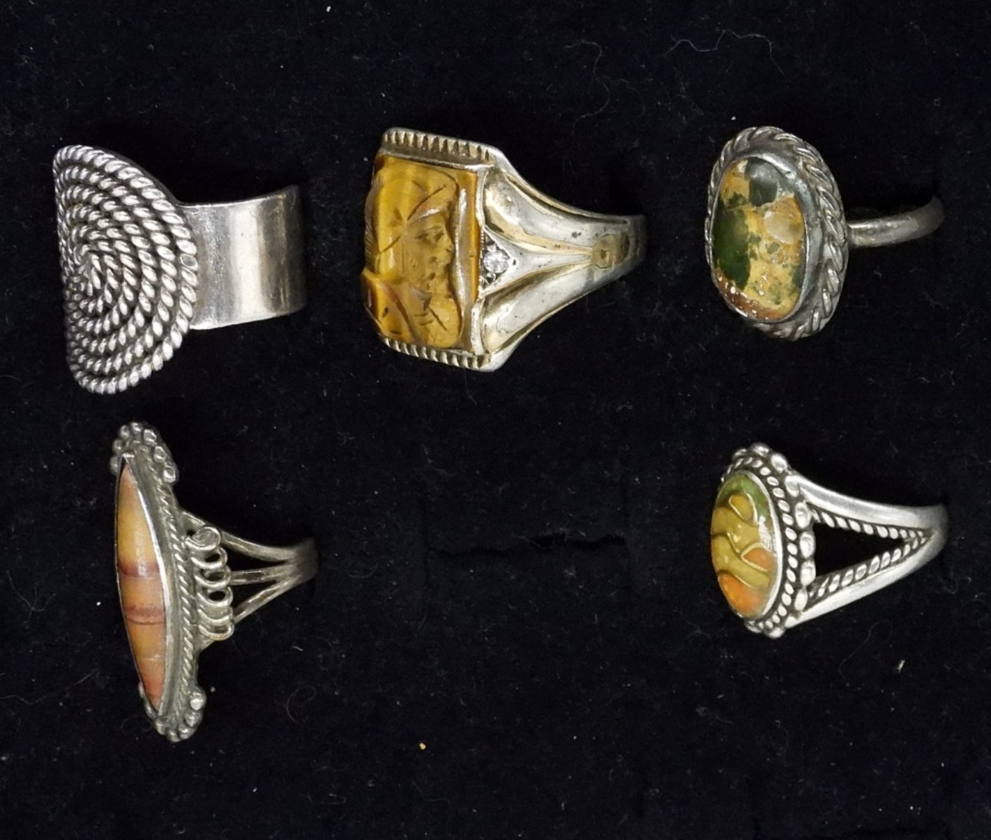 FIVE STERLING SILVER RINGS. ONE TAXCO RING, SWIRL PATTERN TOP (TB-174 MEXICO 925). SIZES 3-10 (24.8 DWT)