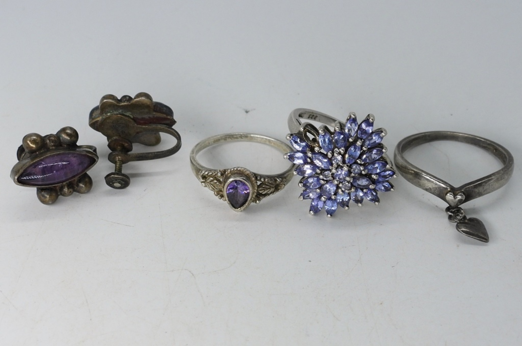 THREE STERLING RINGS, SIZES 7 & 9. ONE PAIR OF VINTAGE STERLING PURPLE GEMSTONE SCREW BACK EARRINGS. (8.6 DWT)