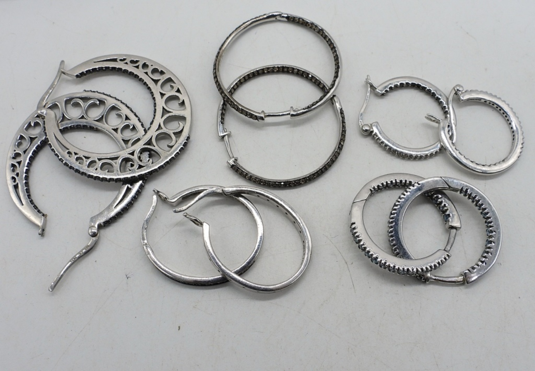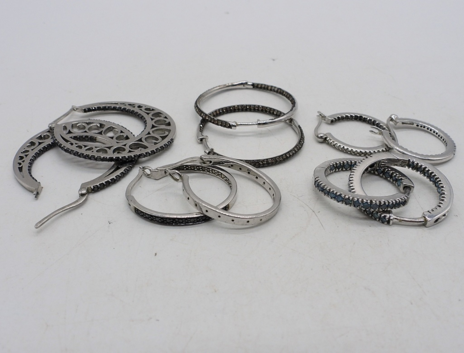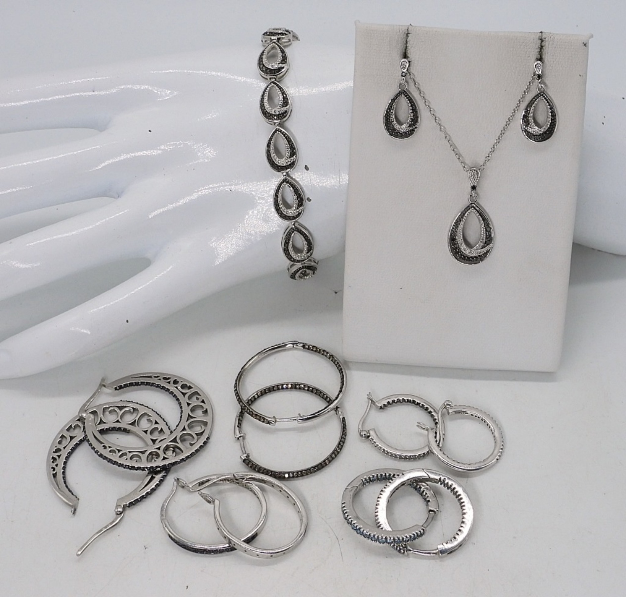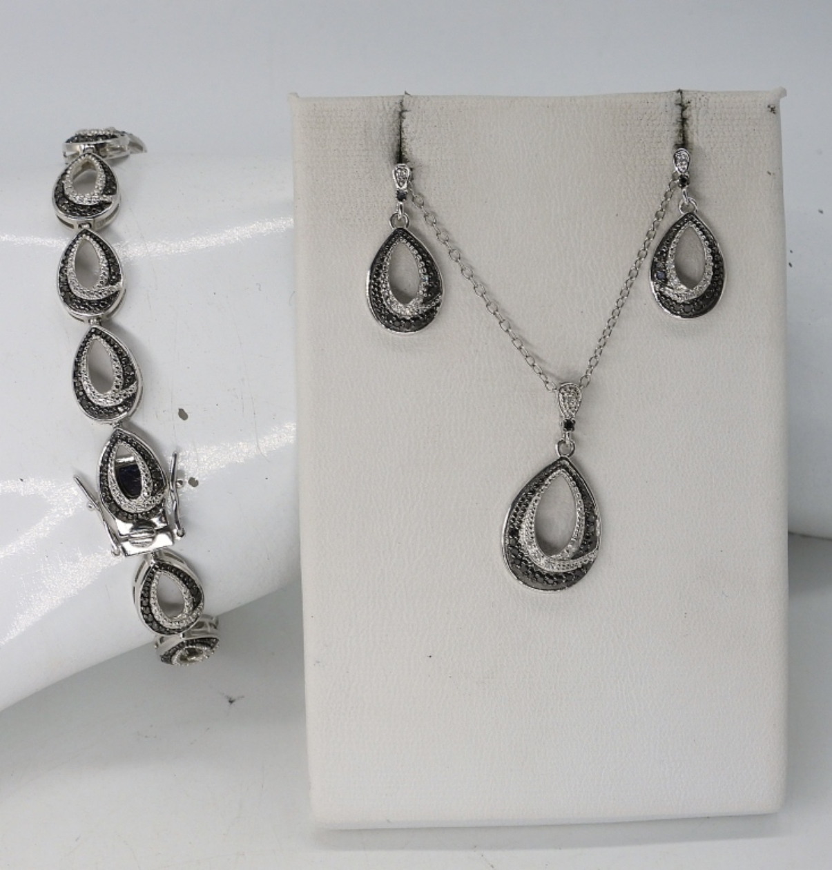 FIVE PAIR OF STERLING DIAMOND/MOISSANITE PIERCED EARRINGS. MATCHING BLACK/WHITE GEMSTONE NECKLACE 18″/ BRACELET 7″/ EARRINGS. (26 DWT)