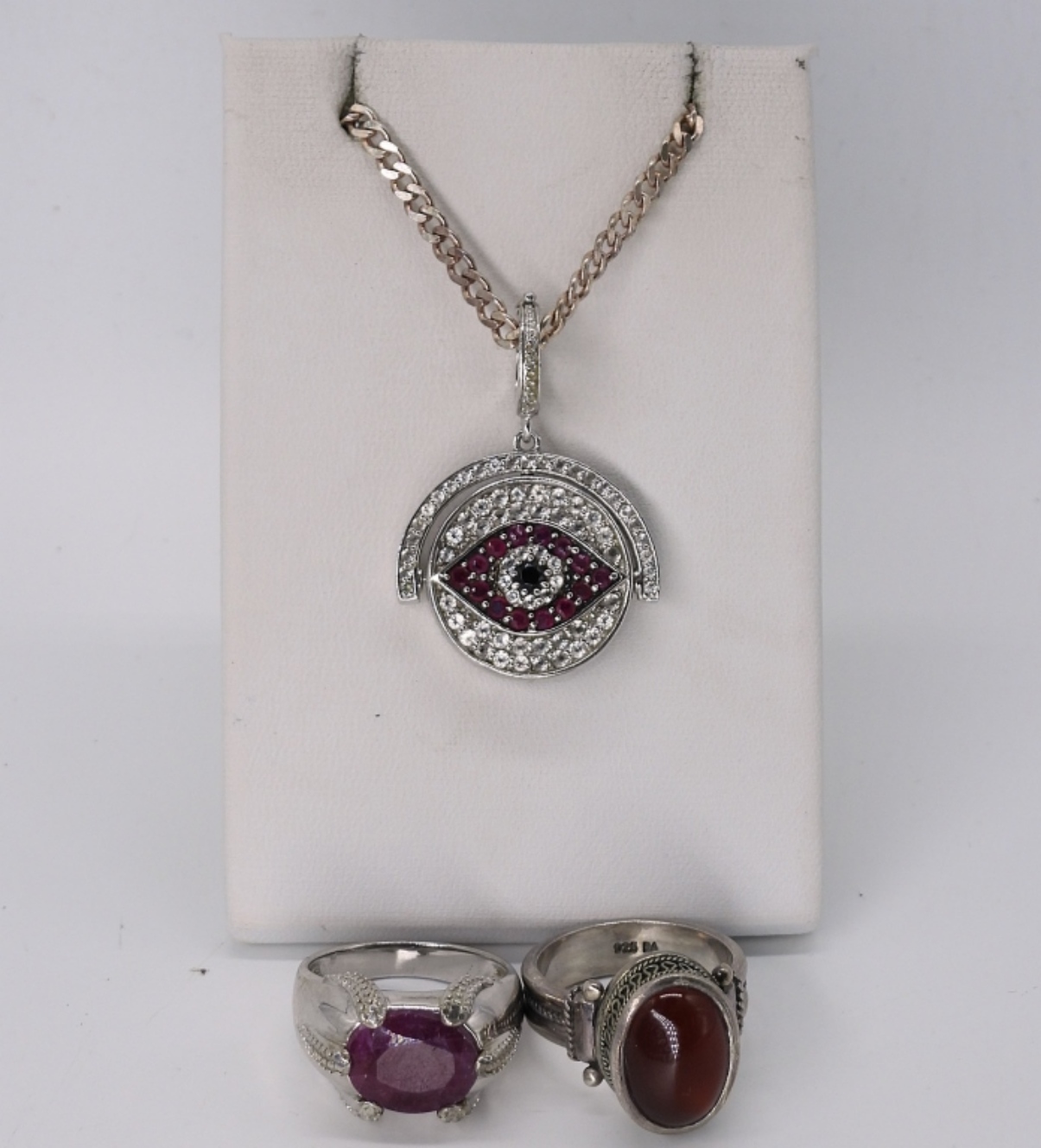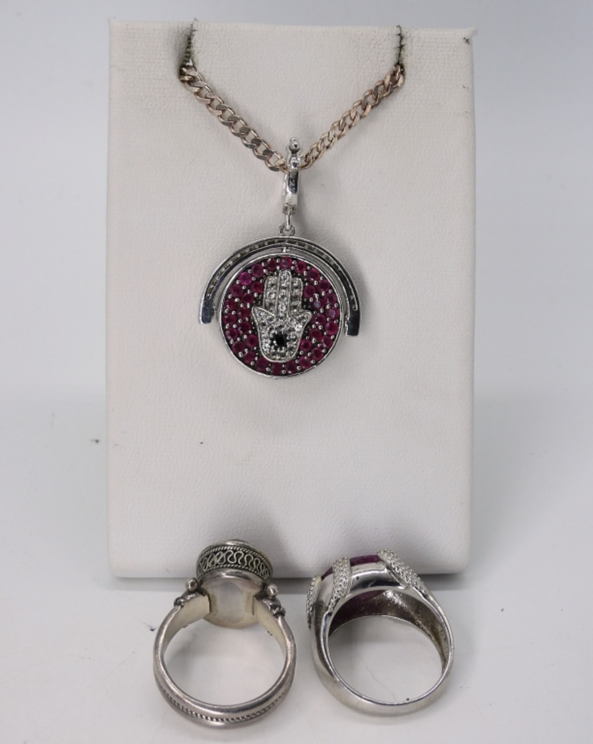 STERLING PENDANT WITH A HAMSA ON ONE SIDE & EVIL EYE ON THE OTHER. RUBY TYPE GEMSTONES. 30″ STERLING CHAIN. TWO STERLING RINGS WITH RED GEMSTONES, SIZE 8. (25 DWT)