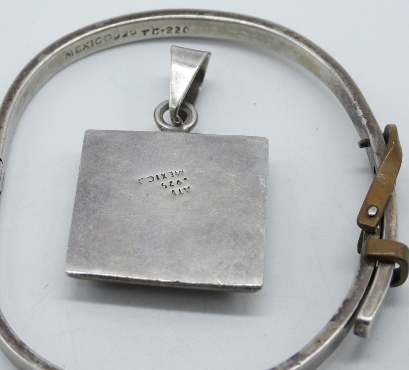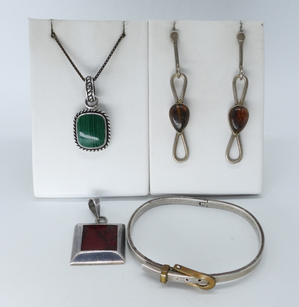 TAXCO STERLING BELT BRACELET “TC-220, MEXICO 925″. TWO GEMSTONE PENDANTS, ONE STERLING CHAIN 18”. ONE PAIR OF VINTAGE PIERCED EARRINGS, 3″ LONG. (28 DWT)