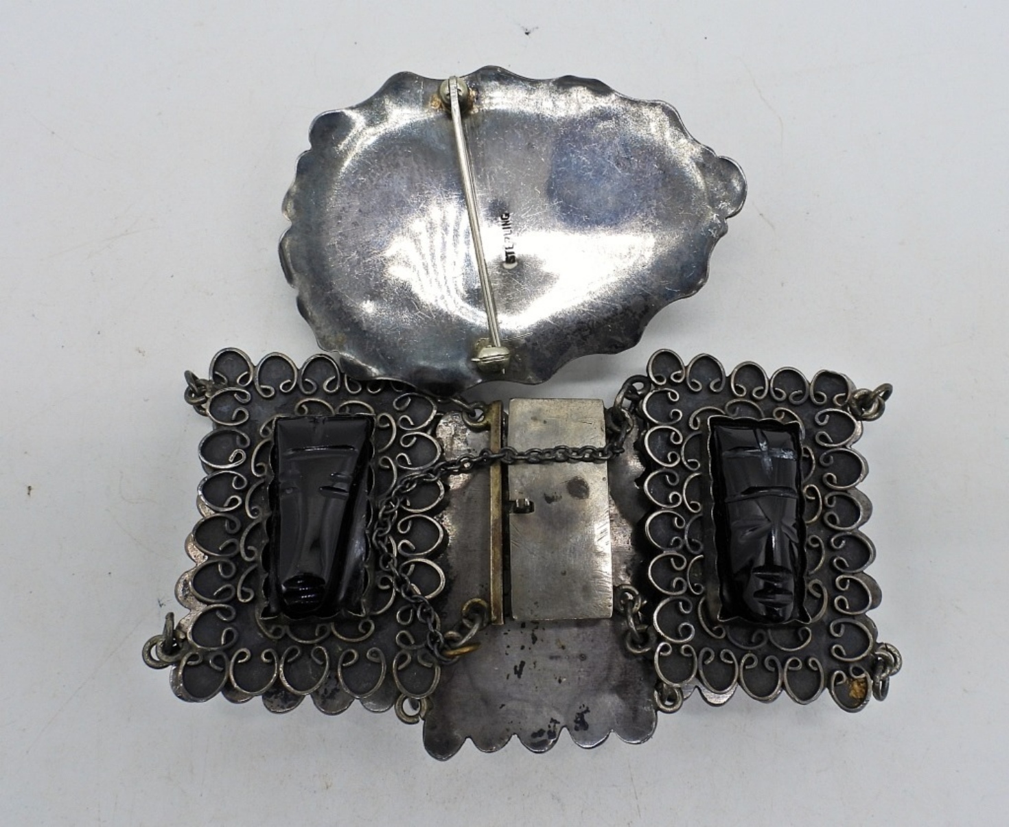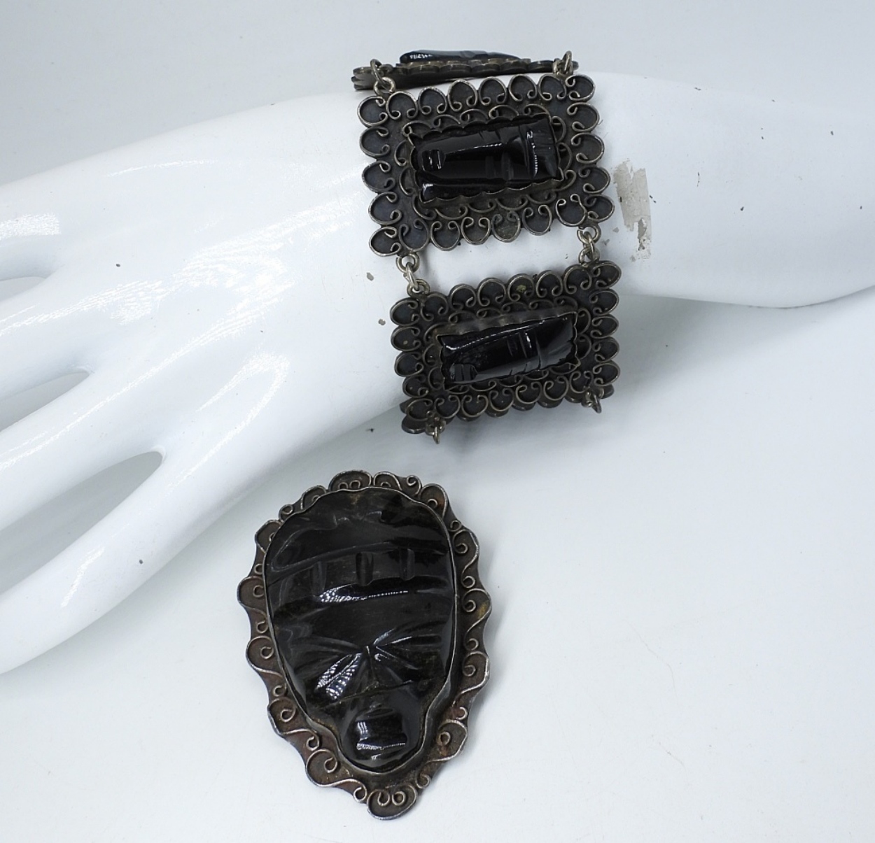 STERLING BRACELET AND BROOCH WITH BLACK ONYX CARVED FACES. BRACELET HAS BEEN TESTED AS STERLING, 8″. BROOCH IS 2.5″ LONG & MARKED STERLING. (45 DWT)