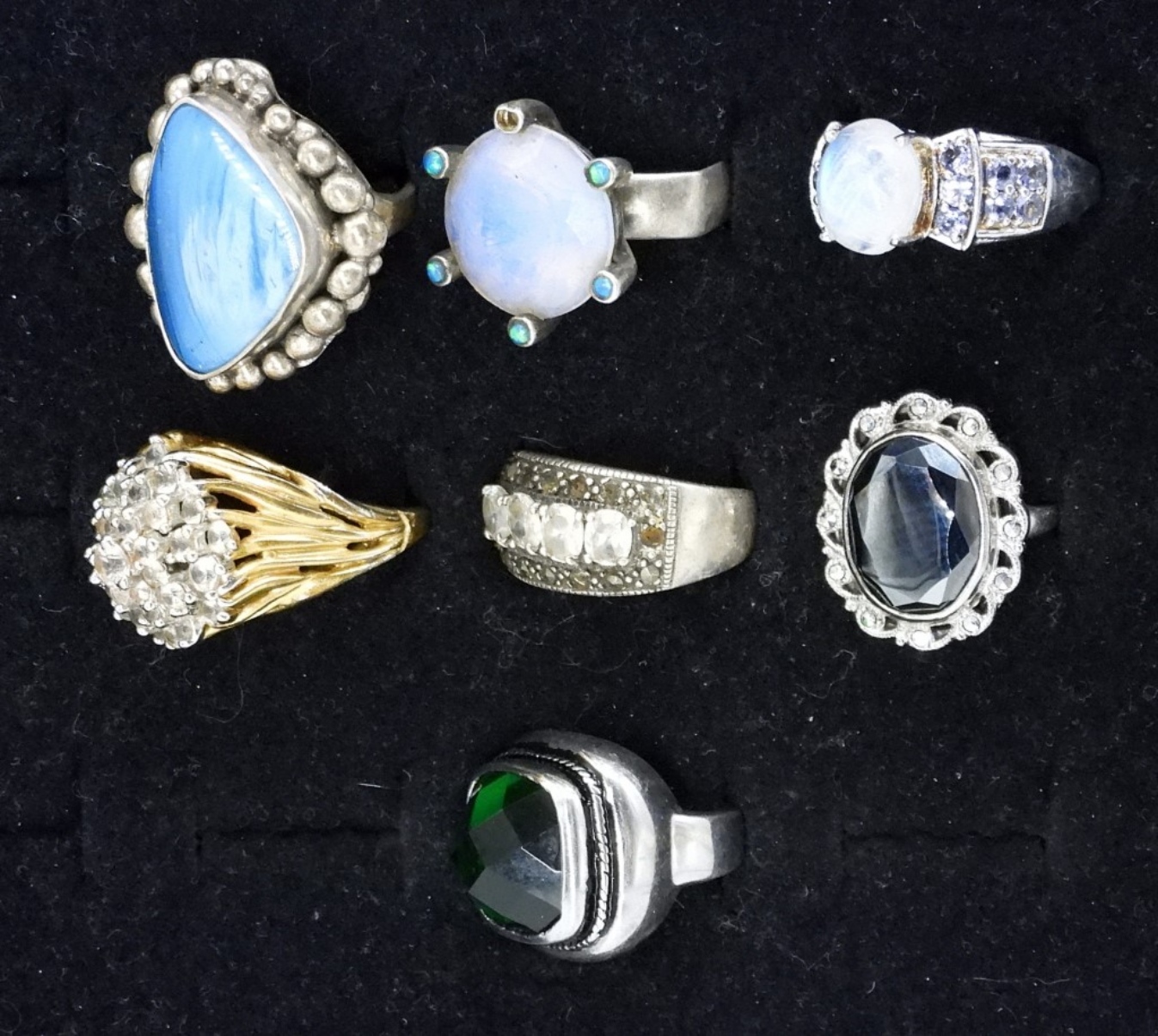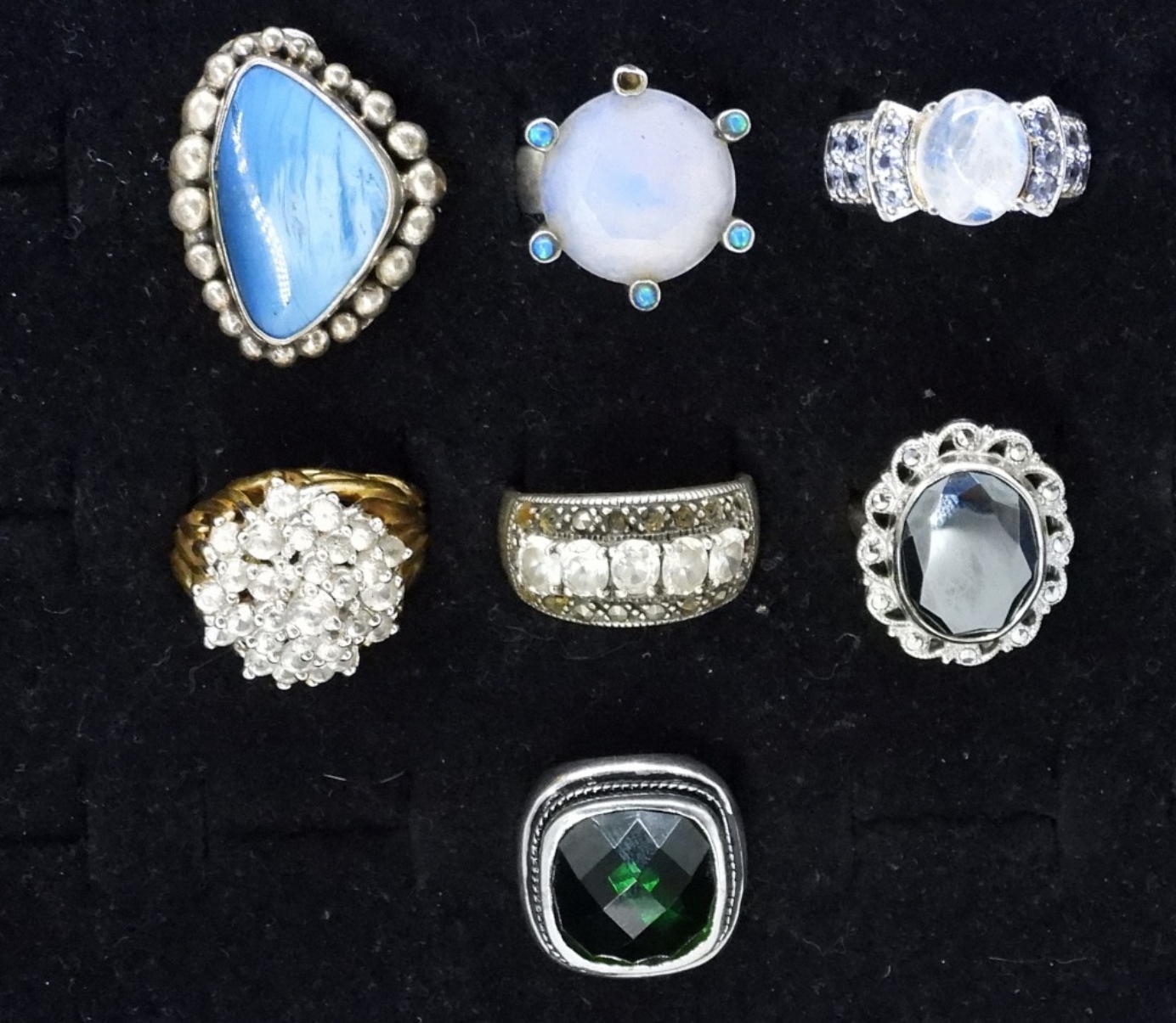 SEVEN LARGE GEMSTONE RINGS. A FEW BANDS ARE MISSHAPEN. SIZES 4-9. (38 DWT)
