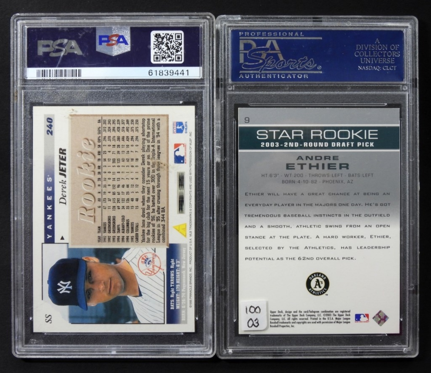 1996- SCORE- #240- DEREK JETER- PSA- 8- NM-MT. 2003- UD PROSPECT PREM.- #9- ANDRE ETHIER- PSA- 8 NM-MT. PREOWNED.