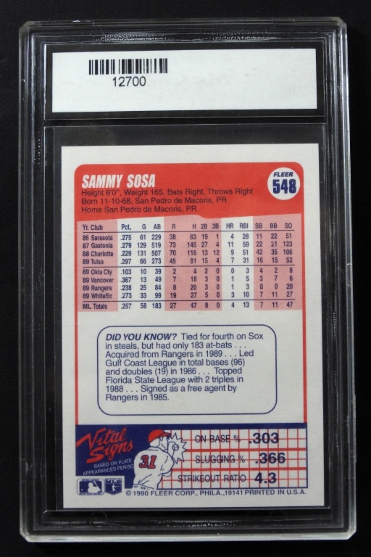 1990- FLEER- #548- SAMMY SOSA- CAPITAL GRADING- 10 GEM MINT. PREOWNED