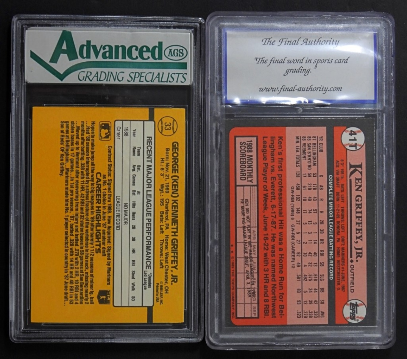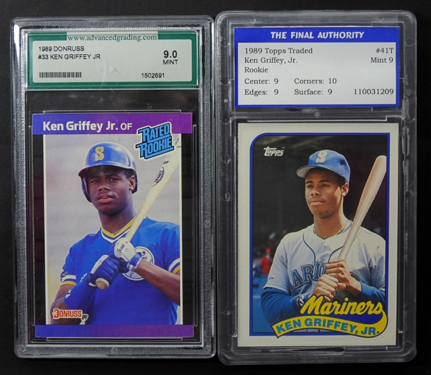 1989- DONRUSS- #33 KEN GRIFFEY JR- ADVANCED GRADING- 9 MINT. 1989 TOPPS-#41T- KEN GRIFFEY JR- THE FINAL AUTHORITY- 9 MINT. PREOWNED.